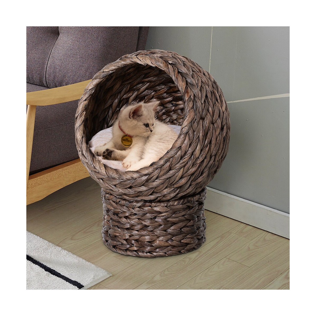 Fabriqué en feuilles de bananier et fourni avec un grand coussin en coton d'une grande douceur, ce panier pour chat deviendra rapidement son petit coin repos préféré ! Grâce à son design original en forme de boule, ce panier attirera fortement votre chat et ajoutera une touche d'originalité et de rafinement supplémentaire à votre intérieur. Caractéristiques : - Espace confortable pour votre chat où il peut se reposer, se cacher ou dormir - Fabriqué en feuilles de bananier assurant légèreté et perméabilité à l'air - Niche principale en forme de boule, design original pour attirer l'attention de votre chat et sublimer votre intérieur - Large base dim. 28,5L x 15l cm pour une stabilité optimale + grande entrée afin de faciliter l'accès au panier - Coussin amovible en coton grande douceur (peluche courte) pour un maximum de confort - Cerclage métal offrant plus de rigidité et sécurité Spécifications : - Couleurs principales : gris (panier), beige (coussin) - Matériaux principaux : feuilles de bananier, coton, métal - Dim. totales : 42L x 33l x 52H cm - Dim. niche ronde : 42L x 32l x 33H cm - Dim. base : 28,5L x 15l cm - Dim. coussin : 40L x 40l x 2,5H cm - Charge max. recommandée : 10 Kg - Livraison effectuée en un colis - Réf. : D30-105GYSpécifications techniques