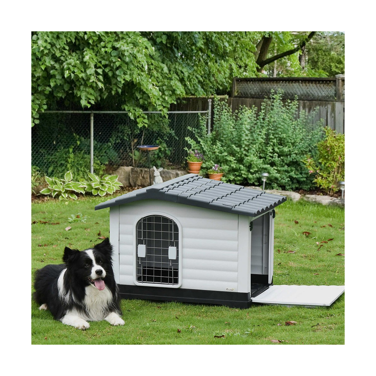 Cette superbe niche style cottage est un modèle sympathique et original en forme de maison cottage, entièrement fabriqué en polypropylène linéaire, beaucoup plus résistant que le plastique standard et non toxique, adapté pour les aliments de votre animal préféré. Sa grande taille dim. 91L x 69l x 66H cm et conception à double entrée (une grande, une petite) légèrement surélevée offrira tout le confort dont a besoin votre chien. Caractéristiques : - Niche chien cottage mélant originalité et élégance : toit double pente imitation tuiles noires, panneaux latéraux texture imitation bois blanc, base surélevée coloris noir - Niche d'une grande originalité unique et fonctionnelle qui fera plaisir à votre compagnon à quatre pattes - Double porte d'accès : petite porte grillagé et grande porte verrouillable adaptée aux chiens de plus grand gabarit - Peut accueillir confortablement des chiens de petite et moyenne taille - Ventilation optimale grâce à la porte grillagée et grille d'aération arrière ; niche tenue à l'écart de l'humidité grâce à sa base surélevée - Conception, fabrication de qualité en polypropylène : usage pérenne avec entretien facile, pratique - Niche avec toit en pente qui facilite le glissement de la neige, de la pluie et du vent : résistance aux intempéries assurée à long terme - Montage facile, rapide à l'aide du manuel d'assemblage illustré fourni Spécifications : - Couleurs principales : blanc, noir, gris - Matériaux principaux : polypropylène, métal - Dim. totales : 91l x 69P x 66H cm - Dim. intérieures : 79l x 54P x 59 / 47,7H cm - Hauteur base : 5H cm - Dim. porte grillagée : 24,8L x 38,5H cm - Dim. grille d'aération : 18l x 10H cm - Charge max. recommandée : 30 Kg - Livraison effectuée en un colis - Réf. : D02-067GYSpécifications techniques
