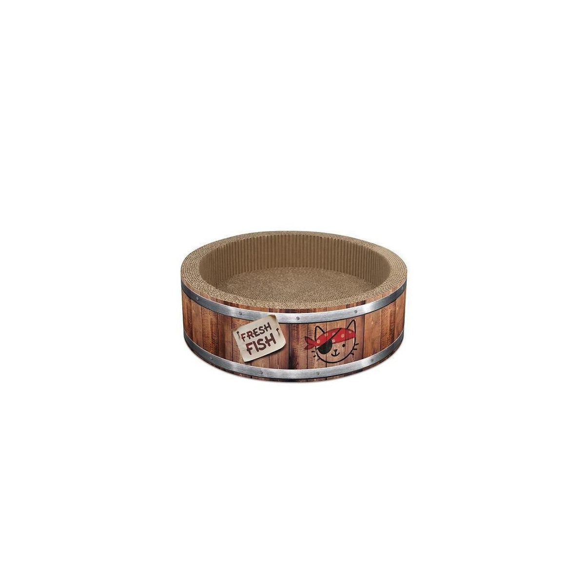 Griffoir Pirates Play en forme de baril - Petit format - En carton - Herbe a chat incluse - Ce baril constitue le meilleur endroit pour se faire les griffes ou pour relaxer apres une journée remplie d'aventures - Ø 36 cm (14 po) - Marron.Spécifications techniques