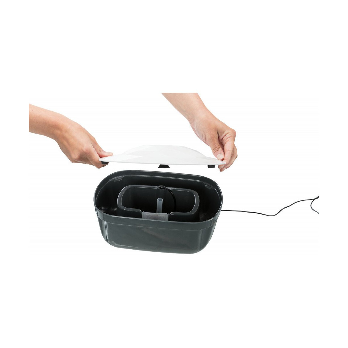 Fontaine d'eau Polygon enrichit l'eau en oxygène circulation d'eau fraîche avec filtre charbon actif, garantit une meilleure qualité de l'eau pompe silencieuse et réglable, interchangeable le couvercle et la partie inférieure sont lavables au lave-vaisselle en mélamine/silicone Fontaine d'eau Polygon contenance 2,5 litres . dimension 28 × 11 × 22 cm Coloris: gris/blanc Fontaine d'eau Polygon enrichit l'eau en oxygène circulation d'eau fraîche avec filtre charbon actif, garantit une meilleure qualité de l'eau pompe silencieuse et réglable, interchangeable le couvercle et la partie inférieure sont lavables au lave-vaisselle en mélamine/silicone Fontaine d'eau Polygon contenance 2,5 litres . dimension 28 × 11 × 22 cm Coloris: gris/blanc Photo non contractuelle, car il y a plusieurs vendeurs sur une même fiche produit.Spécifications techniques