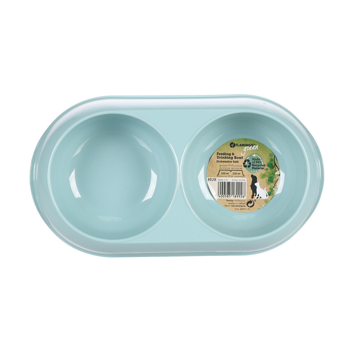Gamelle en plastique recyclé MUK 2 x 200 ml. pour chien et chat. gamelle pour l'eau , la nourriture sèche ou humide. dimension longueur total 23 cm largeur 13 cm. hauteur 4 cm. contenance 2 x 200 ml. couleur bleu clair. gamelle fabriqué avec 98 % de matériel recyclée . Gamelle en plastique recyclé MUK 2 x 200 ml. pour chien et chat. gamelle pour l'eau , la nourriture sèche ou humide. dimension longueur total 23 cm largeur 13 cm. hauteur 4 cm. contenance 2 x 200 ml. couleur bleu clair. gamelle fabriqué avec 98 % de matériel recyclée . Photo non contractuelle, car il y a plusieurs vendeurs sur une même fiche produit.Spécifications techniques