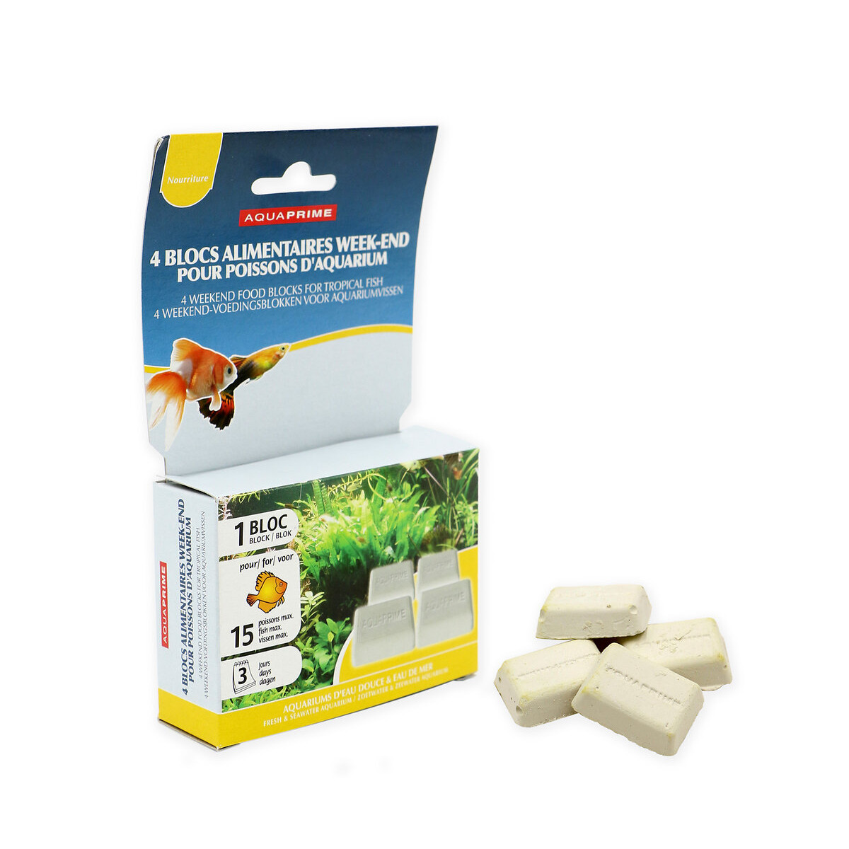Idéal pour bien nourrir vos poissons durant votre absence, le bloc alimentaire week-end vous permet de partir en toute tranquilité. Un bloc suffit pour un aquarium de 40 à 60 litres ou pour 10 à 15 poissons et dure 3 jours environ.En plus d'apporter la nourriture quotidienne à vos poissons, le bloc contribue à la stabilisation du pH, à la baisse des nitrates dans l'eau et à l'amélioration de la digestion des poissons. Boîte de 4 blocs.