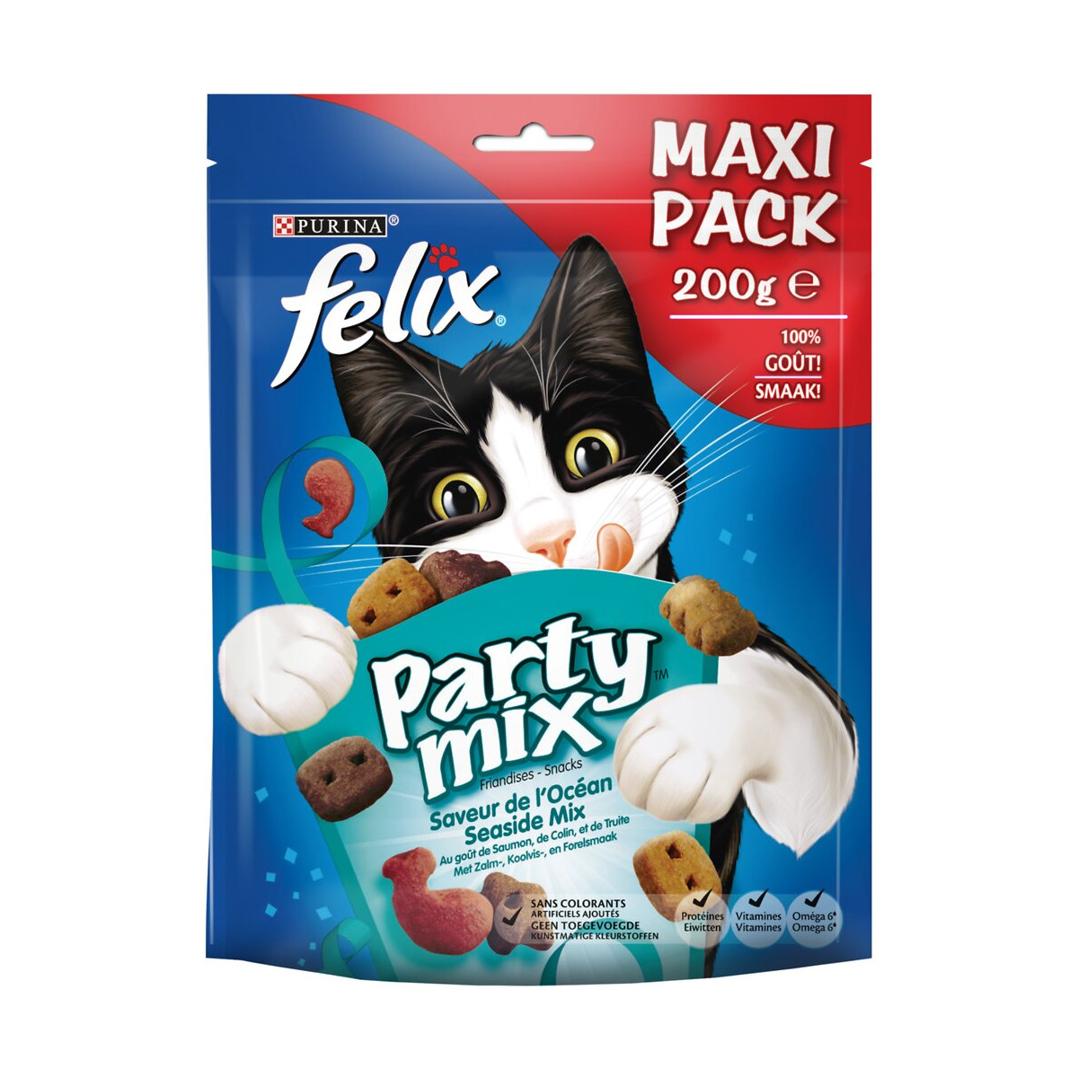 Friandises FELIX Party Mix Saveur de L'Océan : Saumon, Colin, Truite - 200 g - Friandises pour chat Assortiment coloré de friandises aux arômes alléchants, aux saveurs délicieuses et à la texture appétissante Contient des protéines, des vitamines et des acides gras Oméga 6 pour aider votre chat à vivre une vie saine et heureuse.Spécifications techniques