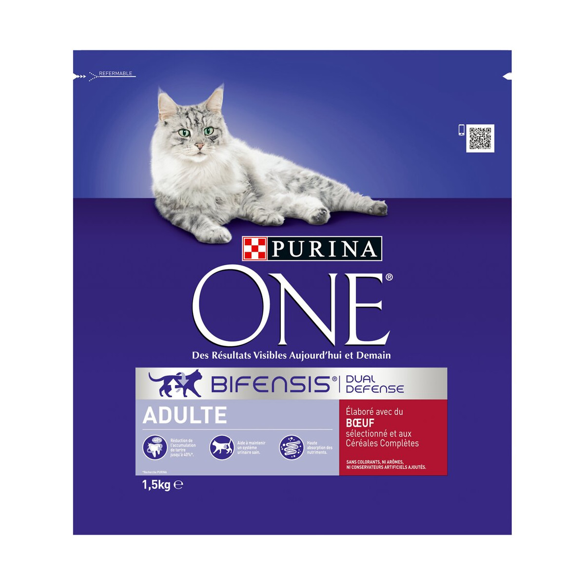 PURINA ONE Chat Adulte - au Boeuf et aux Céréales Complètes - 1,5 KG - Croquettes pour chat adulte PURINA ONE Adulte est spécialement formulé pour les chats âgés de plus de 1 an. Réduction de l'accumulation de tartre jusqu'à 40 %*. *Recherche PURINA.Spécifications techniques