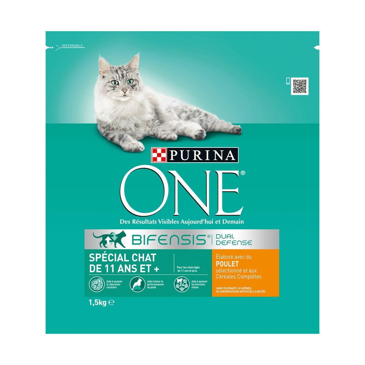 PURINA ONE Chat de 11 ans et + - au Poulet et aux Céréales Complètes - 1,5kg - Croquettes pour chat âgé de 11 ans et plus PURINA ONE Spécial Chat de 11 ans et plus est spécialement formulé pour répondre aux besoins nutritionnels des chats âgés de 11 ans et plus. Aide à soutenir la réparation cellulaire grâce aux vitamines E et C.Spécifications techniques