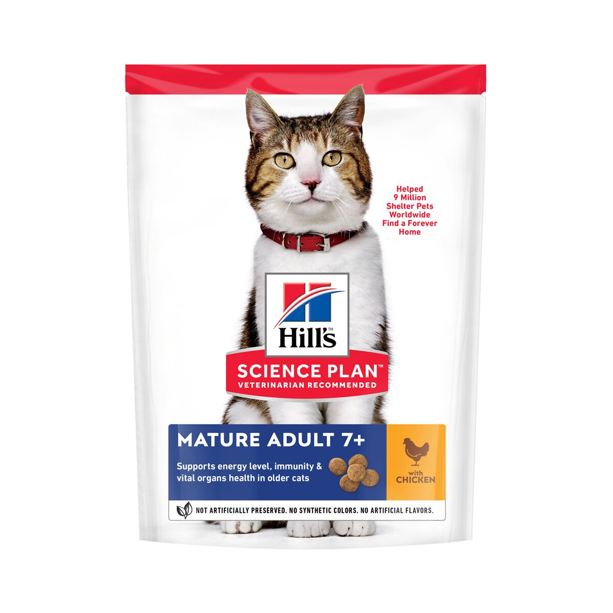 A l'âge de sept ans, les chats atteignent ce que l'on appelle le stade « Mature » de la vie et leur besoins nutritionnels sont différents de ceux des adultes, il est conseillé de changer leur alimentation. Grâce à des teneurs adaptées en vitamines, protéines, matières grasses et minéraux, Hill's Science Plan Mature Adult 7+ permet d'aider votre chat senior à rester jeune plus longtemps. Spécialement formulées pour les besoins des chats vieillissants, les croquettes Hill's Science Plan Mature Adult 7+ contiennent des protéines de qualité supérieure qui aident à maintenir la masse musculaire des chats âgés de 7 ans et plus. La présence d'antioxydants et de vitamines C+E ralentit le vieillissement cellulaire, maintient les reins en bonne santé et soutient le système immunitaire de votre chat. Cet aliment complet et hautement digestible contient un juste équilibre de tous les éléments nutritifs dont votre chat mature a besoin pour vivre à vos côtés le plus longtemps possible. Pour varier les plaisirs de votre chat, vous pouvez lui donner des sachets repas Hill's Science Plan Feline Mature Adult 7+, en complément ou en alternance de ses croquettes. En plus, vous allez adorer le nouveau look des sacs Hill's Science Plan. Recommandé par les vétérinaires. Elaboré à partir d'ingrédients de haute qualité. Croquettes faciles à digérer pour les chats matures de 7 ans et +. Soutient la santé de la peau et du pelage grâce à la vitamine E, aux oméga-3 et aux oméga-6.Spécifications techniques