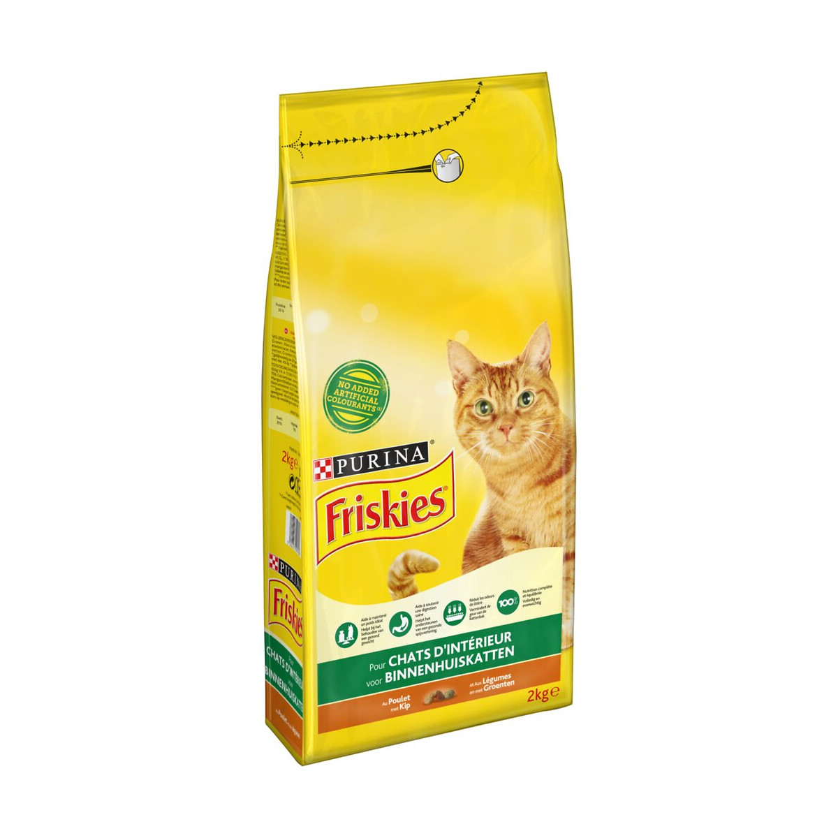 Croquettes chat FRISKIES Pour CHATS D'INTÉRIEUR Au Poulet et aux Légumes - 2 KG - Croquettes pour chat adulte Nutrition savoureuse et 100% complète élaborée avec des ingrédients sélectionnés de qualité. Contrôle des boules de poils : Avec des fibres pour aider à réduire la formation des boules de poils. Réduction des odeurs de litière : Contient de la chicorée, un légume, pour aider à réduire les odeurs de litière.Spécifications techniques