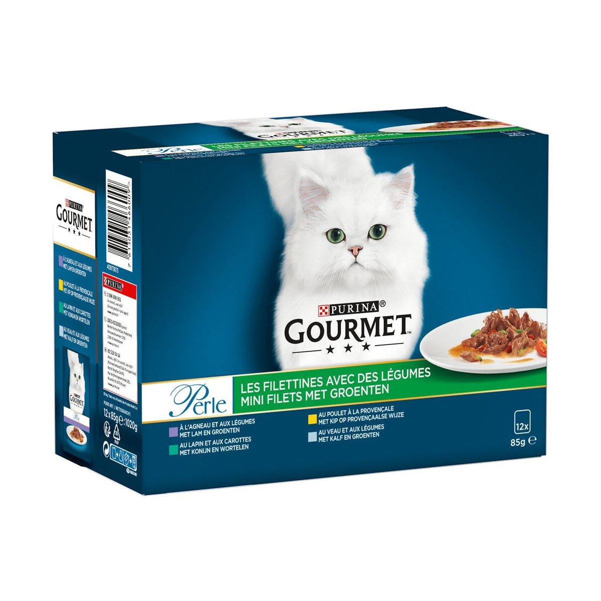 Sachets chat GOURMET® Perle Les Filettines avec des Légumes - Sachets fraîcheur pour chat adulte - 12 x 85 g. Sans arômes artificiels ajoutés, sans conservateurs artificiels ajoutés et sans colorants artificiels ajoutés.Spécifications techniques