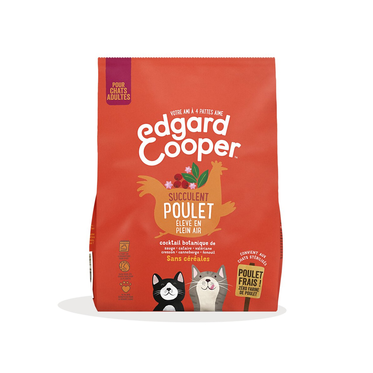 Des croquettes au poulet simplement irrésistibles, riches en saveurs, protéines et bienfaits.. Comment cette recette est-elle fabriquée? Nous fabriquons cette recette avec un max de poulet élevé en plein air de sources éthiques, et notre mélange emblématique d’herbes, baies et végétaux. Cela veut dire pas de farines de viande et rien d’artificiel, de transformé ou de séché. Nous cuisons lentement nos croquettes par petites quantités pour préserver leurs bienfaits naturels, et nous y ajoutons des prébiotiques et de l’huile de lin pour augmenter leurs qualités nutritionnelles et faciliter leur digestion. Cette recette contient également de la glucosamine et de la chondroïtine, bénéfiques pour la santé des articulations, et de la taurine, un nutriment essentiel pour les yeux et le cœur. Pour qui ? Difficile de trouver un chat qui résiste à l’odeur et au goût délicieux du poulet. Les chats sont carnivores, alors nos recettes contiennent au minimum 60% de viande riche en protéines. Nous y ajoutons un mélange bien équilibré d’herbes, de baies et de végétaux, conçu pour appâter même le mangeur le plus difficile. Cette recette est hypoallergénique, ce qui veut dire qu’elle est parfaite pour les chats réactifs aux autres viandes. Cette recette sans céréales convient aux chats stérilisés. Convient aux chats adultes stérilisés ou actifs de toutes races. Points forts de la marque De la viande fraîche et des ingrédients naturels Sacs biodégradables d'origine végétale et boites recyclables 10% des bénéfices reversés à des associations Ethical Award Composition poulet frais 60 %, patates douces, pois, protéine de pois, sauce à base de poulet, graisse de poulet, graine de lin, minéraux, manno-oligosaccharides (MOS), fructo-oligosaccharides (FOS), sauge 0,03 %, valériane 0,03 %, airelles 0,03 %, fenouil 0,03 %, cresson 0,03 %, cataire 0,03 %, glucosamine, sulfate de chondroïtineSpécifications techniques