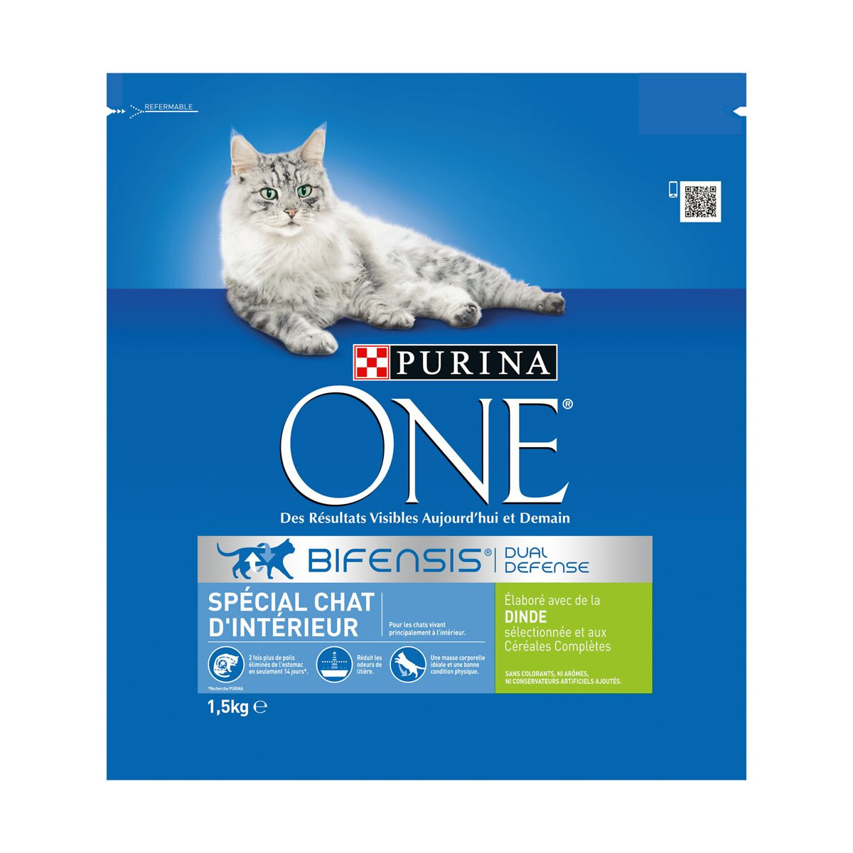 PURINA ONE Chat d'Intérieur - à la Dinde et aux Céréales Complètes - 1,5kg - Croquettes pour chat adulte PURINA ONE Spécial Chat d'Intérieur est spécifiquement formulé pour limiter la formation de boules de poils. Avec des fibres reconnues pour aider à éliminer deux fois plus de poils accumulés dans l'estomac en seulement 14 jours*. * Recherche PURINA.Spécifications techniques