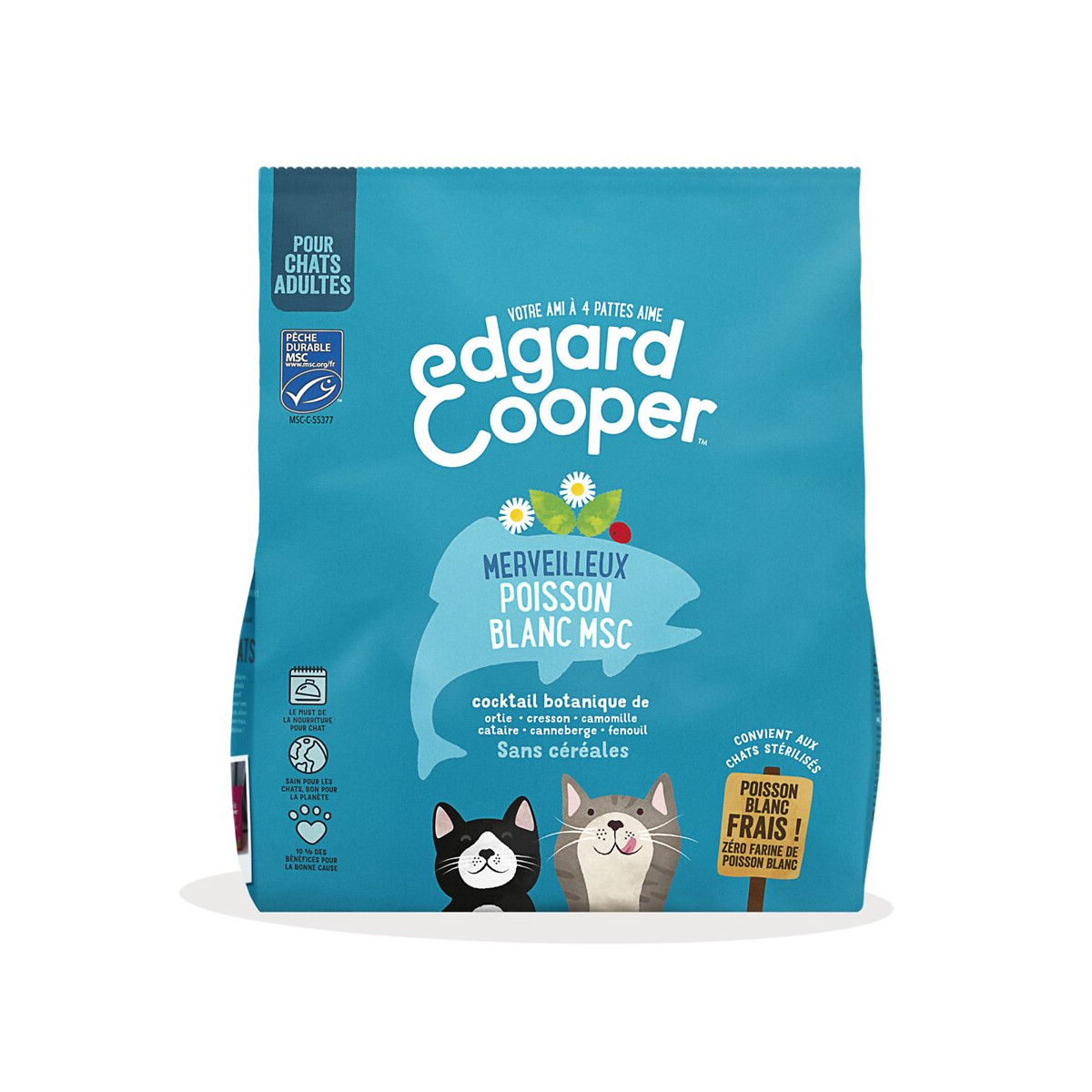 Nourriture pour chats naturellement savoureuse au poisson riche en Oméga-3 pour un pelage doux et soyeux. Comment cette recette est-elle fabriquée? Une recette appétissante qui contient un max de poisson blanc certifié MSC, associé à un mélange soigneusement équilibré d’herbes, baies et végétaux. Cela veut dire pas de farine de poisson et rien d’artificiel, de transformé ou de séché. Nous cuisons nos croquettes lentement par petites quantités pour préserver leurs bienfaits naturels, et nous y ajoutons de l’huile de saumon et de lin pour améliorer leurs qualités naturelles et faciliter leur digestion. Cette recette contient également de la glucosamine et de la chondroïtine, bénéfiques pour la santé des articulations, et de la taurine, un nutriment essentiel pour les yeux et le cœur. Pour qui ? C'est une excellente recette polyvalente, avec une odeur et un goût irrésistibles que votre chat va adorer. Nous veillons à ce que nos aliments pour chats soient toujours composés d'au moins 60 % de viande ou de poisson riche en protéines, pour satisfaire les appétits carnivores des chats. Notre poisson blanc certifié MSC est riche en oméga 3, ce qui contribuera à donner à votre chat un pelage doux et brillant. Cette recette ne contient pas de céréales et convient aux chats stérilisés. Convient aux chats adultes stérilisés ou actifs de toutes races. Points forts de la marque De la viande fraîche et des ingrédients naturels Sacs biodégradables d'origine végétale et boites recyclables 10% des bénéfices reversés à des associations Ethical Award Composition poisson blanc frais MSC 60 %, patates douces, pois, protéine de pois, huile de saumon, sauce à base de poulet, graisse de poulet, graine de lin, minéraux, manno-oligosaccharides (MOS), fructo-oligosaccharides (FOS), ortie 0,03 %, camomille 0,03 %, airelles 0,03 %, fenouil 0,03 %, cresson 0,03 %, cataire 0,03 %, glucosamine, sulfate de chondroïtineSpécifications techniques