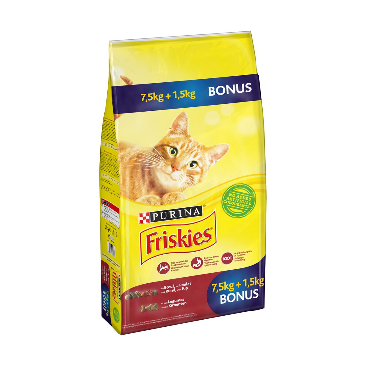Croquettes FRISKIES Chat Au Bœuf, au Poulet et aux Légumes - 7,5 KG + 1,5 KG BONUS - Croquettes pour chat adulte Avec des fibres d’origine naturelle pour favoriser une bonne digestion Dents et os sains grâce aux minéraux essentiels et à la vitamine D Muscles toniques grâce aux protéines de haute qualité.Spécifications techniques