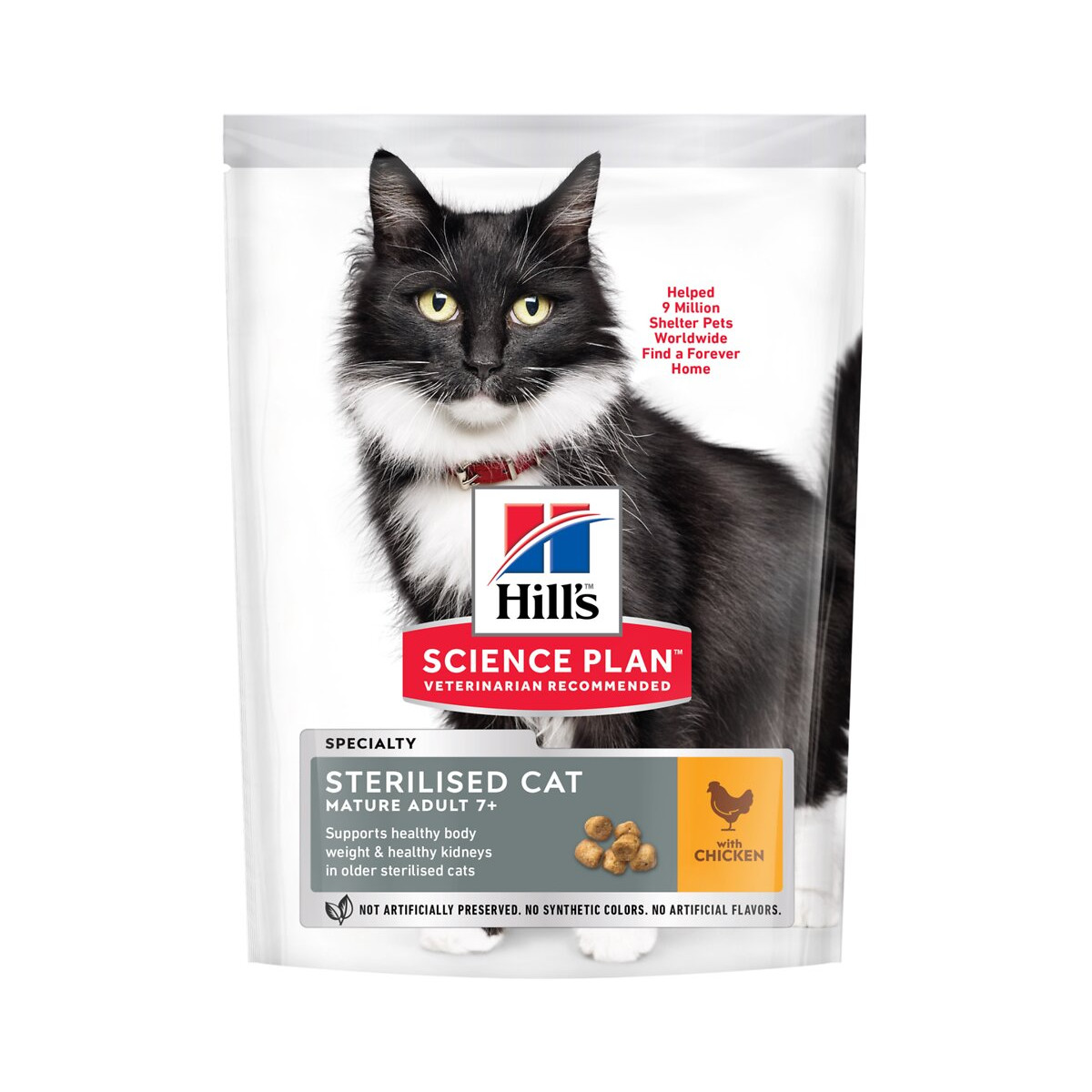 La stérilisation du chat entraine certaines modifications dans son métabolisme et dans son comportement. Son appétit augmente, alors que ses besoins énergétiques diminuent. Plus sédentaire et moins actif, il prend alors du poids. La stérilisation favorise également le développement de troubles urinaires. Votre chat stérilisé a donc besoin d'une alimentation spécifique. Hill's Science Plan Sterilised Cat Mature Adult est parfaitement adapté aux besoins des chats stérilisés âgés de 7 ans et +. Sa formule unique de gestion de poids aide votre chat stérilisé à maintenir son poids idéal, et à rester en pleine forme pour longtemps. En plus, vous allez adorer le nouveau look des sacs Hill's Science Plan. Elaboré à partir d'ingrédients de haute qualité. Faible teneur en graisse avec des niveaux élevés de L-lysine pour préserver la vitalité des chats stérilisés matures âgés de 7 ans et +. Des niveaux de minéraux contrôlés pour un système urinaire sain. Cette formule unique contient une forte teneur en L-carnitine à l'efficacité prouvée, pour aider les chats stérilisés à rester minces et actifs.Spécifications techniques