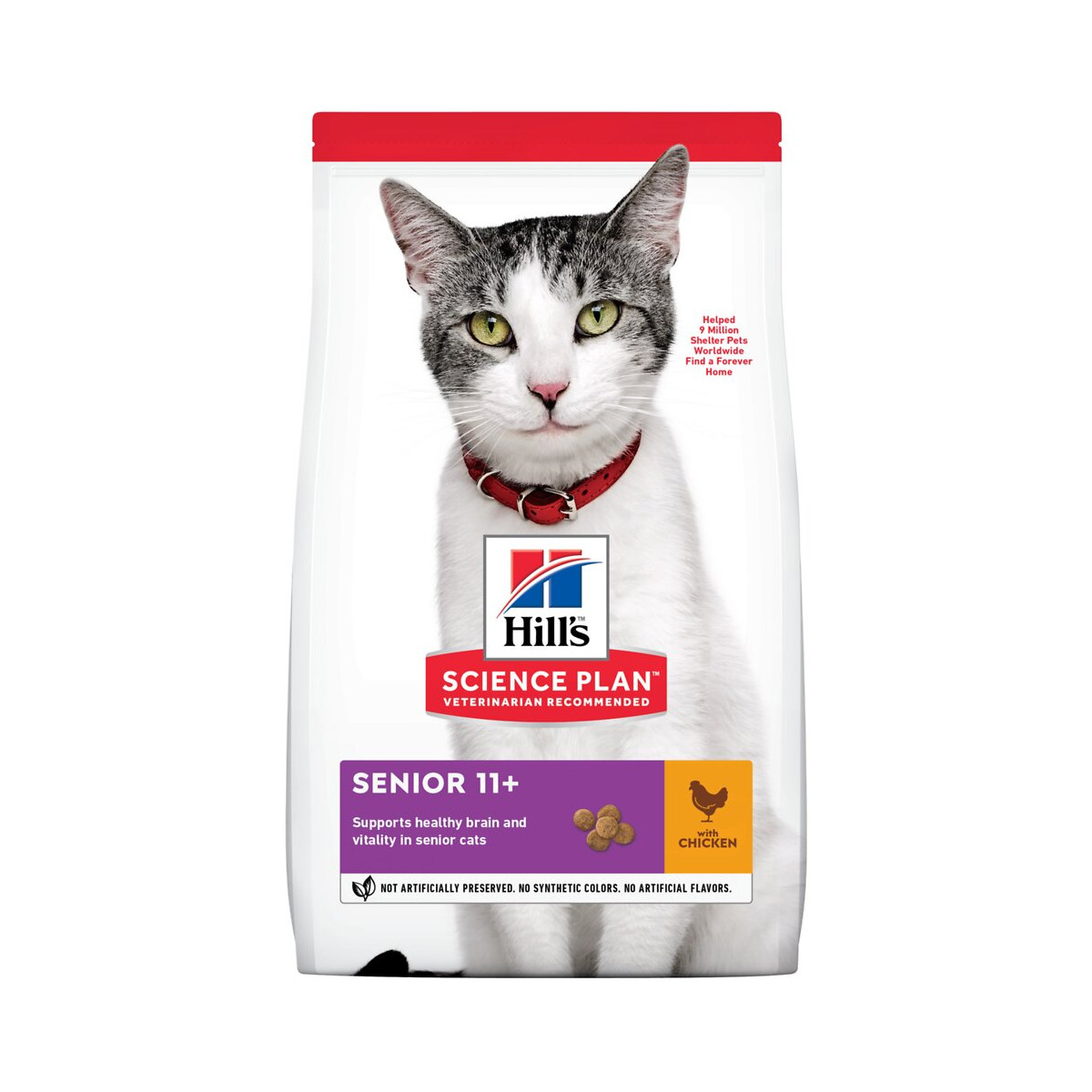 A l'âge de 11 ans, votre chat entre dans une nouvelle phase de vie qui peut s'accompagner d'une perte d'appétit, d'une baisse d'activité, d'un ralentissement du métabolisme ou encore de l'apparition des premiers signes de déficience rénale. Grâce à une alimentation adaptée, vous pouvez l'aider à combattre ces signes du vieillissement précoce. Les croquettes Hill's Science Plan Senior 11+ sont spécialement formulées pour soutenir la bonne santé cérébrale et rénale des chats âgés de 11 ans et + et favoriser leur vitalité. Formulé avec des antioxydants à l'efficacité cliniquement prouvée, des acides gras oméga-3, de la L-carnitine et un mélange d'ingrédients spéciaux, cet aliment aide les chats seniors à rester agiles et alertes plus longtemps et stimule leurs désirs d'interactions. Elaboré à partir d'ingrédients de haute qualité. Avec une teneur optimale de vitamine E, d'oméga-3 et d'oméga-6 pour favoriser la bonne santé de la peau et la beauté du pelage. Ces croquettes pour chats contiennent des ingrédients faciles à digérer avec des fibres pour la bonne digestion de votre chat âgé. Taurine essentielle pour la santé cardiaque et minéraux équilibrés pour soutenir les reins et la vessie.Spécifications techniques