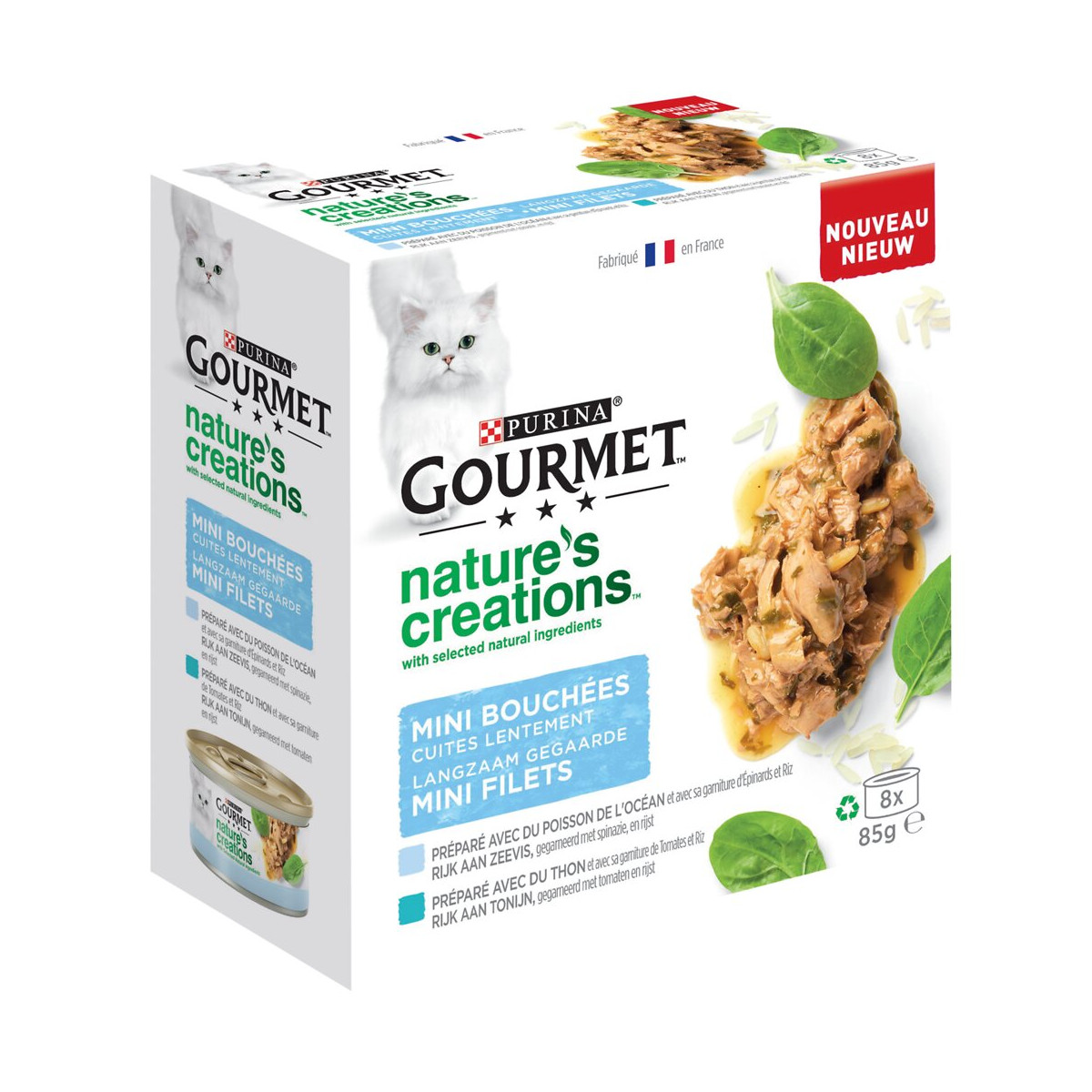 GOURMET Nature's Creations propose de délicieuses recettes inspirées par la nature. Nos recettes soigneusement préparées avec des ingrédients naturels sélectionnés de haute qualité sont cuites avec un grand soin pour des repas exquis. Riche en boeuf, agneau, volaille ou poisson et accompagnée de légumes tels que des épinards, des carottes, des tomates et du riz, nos recettes sont élaborées pour que votre fin connaisseur savoure chaque bouchée avec plaisir et délice. GOURMET Nature's Creations. De délicieux repas inspirés par la nature.Spécifications techniques