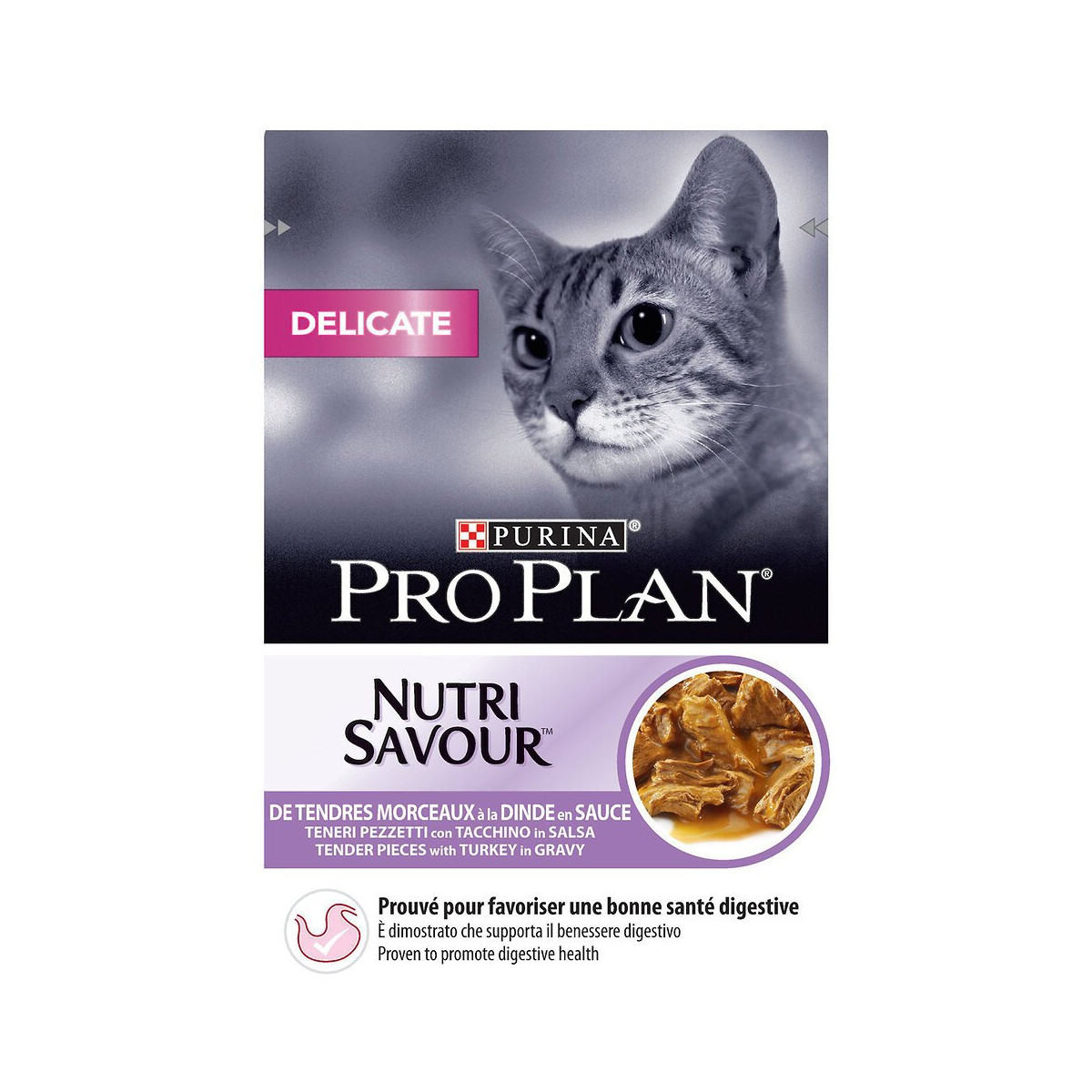 Aliment à la dinde en sauce Pro Plan Nutrisavour Délicate complet et équilibré pour chat adulte. Les tendres morceaux, associés à une sauce savoureuse sont hautement appétents, grâce à une technologie exclusive de Nestlé PURINA. Nutrition haut de gamme dont les bénéfices pour la santé des chats sont scientifiquement démontrés. Facilement digestible grâce à des ingrédients de haute qualité. Moins de réactions cutanées : aide à réduire les réactions cutanées liées à une sensibilité alimentaire. Santé digestive : prouvé pour améliorer la bonne santé digestive, grâce à l'inuline, un prébiotique qui aide à équilibrer la flore intestinale des chats délicats. Contenance : 85 g. Moins de réactions cutanées : aide à réduire les réactions cutanées liées à une sensibilité alimentaire. Santé digestive : prouvé pour améliorer la bonne santé digestive, grâce à l'inuline, un prébiotique qui aide à équilibrer la flore intestinale des chats délicats.Spécifications techniques