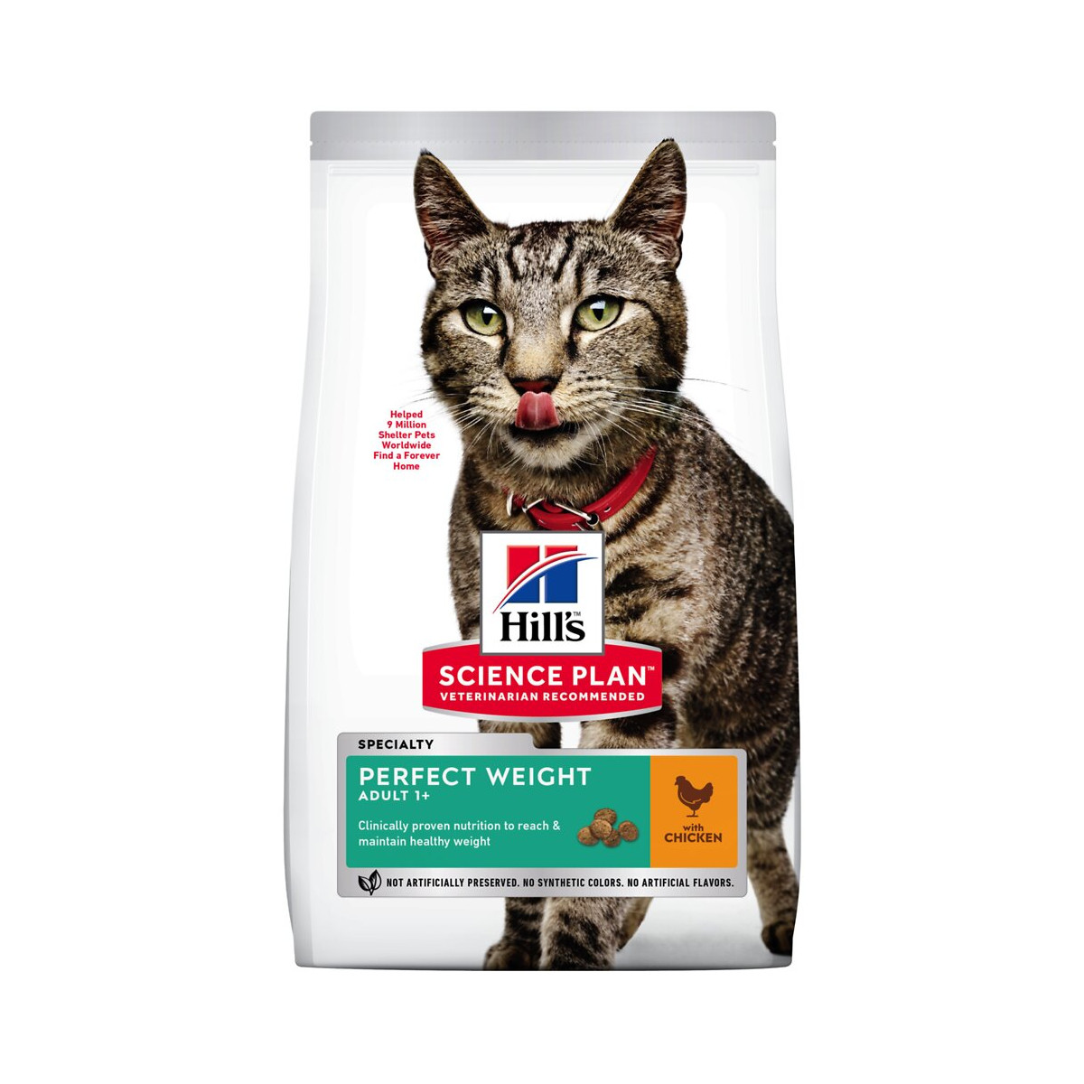 Les chats à leur poids de forme peuvent vivre plus longtemps en bonne santé. Ils participent plus facilement à la vie de famille et jouent activement. Ils sont par la suite moins sujets aux problèmes de santé liés au poids. Perfect Weight est un aliment idéal à long terme pour aider les chats adultes dès 1 an à atteindre et conserver un poids optimal. Contient des niveaux parfaitement équilibrés de fibres et des protéines de haute qualité pour aider votre chat à se sentir rassasié et à contrôler sa sensation de faim entre les repas, tout en maintenant sa masse musculaire. Convient également aux chats stérilisés. Pour varier les plaisirs de votre chat, vous pouvez alterner ou compléter les rations quotidiennes avec les sachets fraicheur Hill's Science Plan Perfect Weight. En plus, vous allez adorer le nouveau look des sacs Hill's Science Plan. Elaboré à partir d'ingrédients de haute qualité. Pour varier ses plaisirs, essayez les sachets repas Hill's Perfect Weight disponibles en plusieurs saveurs. Ces croquettes pour chats contiennent des fibres prébiotiques pour une digestion tout en douceur. Nutrition complète et équilibrée pour les chats en léger surpoids ou ayant tendance à prendre du poids.Spécifications techniques