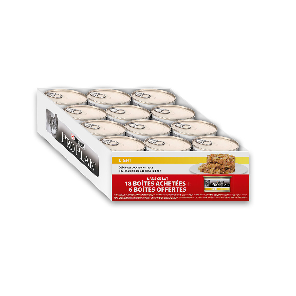 Boites PRO PLAN LIGHT - Bouchées en sauce, à la Dinde - 18 boites 85g + 6 gratuites - Boites repas pour chat adulte Tous les aliments PRO PLAN® sont fabriqués avec le plus grand soin, pour fournir une nutrition haut de gamme avec un goût que les chats adorent.Spécifications techniques