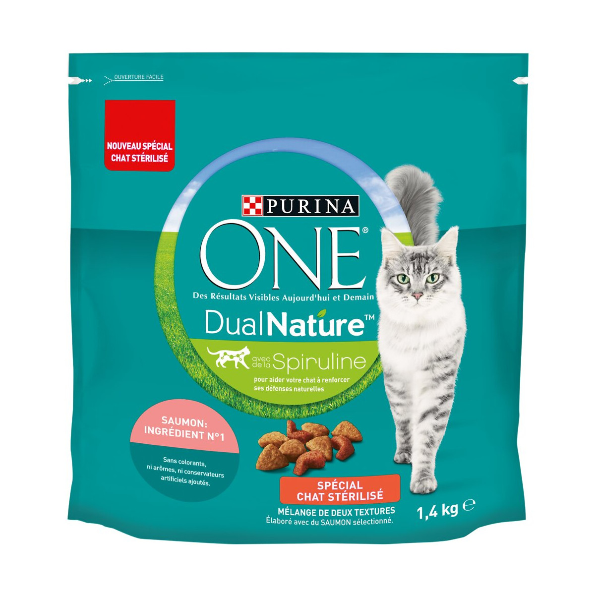 PURINA ONE DualNatureTM Spécial Chat Stérilisé contient de la Spiruline naturelle et propose un mélange savoureux de deux textures. C'est un aliment complet formulé avec tous les nutriments essentiels dont votre chat a besoin et avec du Saumon sélectionné.PURINA ONE DualNatureTM Spécial Chat Stérilisé est spécifiquement formulé avec un profil nutritionnel adapté aux chats castrés ou stérilisés. Cette formule exclusive a été spécialement conçue avec des taux de protéine et de matières grasses adaptés pour aider à maintenir le métabolisme de votre chat stérilisé en bonne santé, à favoriser une masse musculaire idéale et à contrôler son poids. La formule aide aussi à maintenir un système urinaire sain. La Spiruline est un ingrédient naturel qui aide à soutenir les défenses naturelles de votre chat. Issue des eaux chaudes subtropicales et tropicales, la Spiruline est une algue bleue-verte reconnue pour ses qualités nutritionnelles uniques, qui apportent de nombreux bénéfices sur le bien-être de votre chat. Un mélange savoureux de croquettes croustillantes et de croquettes à la texture plus tendre, contenant des protéines de haute qualité, source d'acides aminés, pour aider à maintenir une digestion saine. Développé par les vétérinaires et les nutritionnistes PURINA. Sans arômes artificiels ajoutés, sans colorants artificiels ajoutés, sans conservateurs artificiels ajoutés.Spécifications techniques