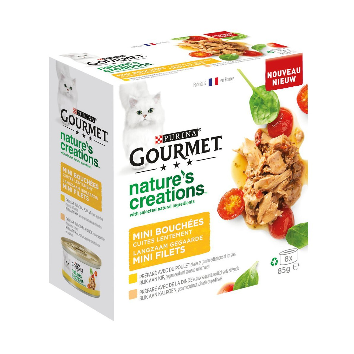 GOURMET Nature's Creations propose de délicieuses recettes inspirées par la nature. Nos recettes soigneusement préparées avec des ingrédients naturels sélectionnés de haute qualité sont cuites avec un grand soin pour des repas exquis. Riche en boeuf, agneau, volaille ou poisson et accompagnée de légumes tels que des épinards, des carottes, des tomates et du riz, nos recettes sont élaborées pour que votre fin connaisseur savoure chaque bouchée avec plaisir et délice. GOURMET Nature's Creations. De délicieux repas inspirés par la nature.Spécifications techniques