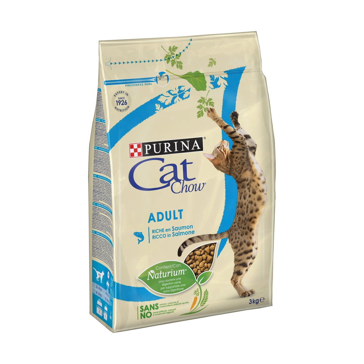 Croquettes PURINA CAT CHOW Adult avec NaturiumTM - Riche en Saumon - 3 KG - Croquettes pour chat adulte Depuis 1926, les experts PURINA ont toujours cherché à mieux connaître les besoins naturels des animaux de compagnie, afin de contribuer à leur bonne santé et à leur bien-être, grâce à une nutrition complète. Notre recette est riche en Saumon et les sources de protéine sont soigneusement sélectionnées pour leur qualité afin de répondre aux besoins naturels des chats. Soigneusement préparé avec des ingrédients naturels (persil, épinards, carottes, céréales complètes, chicorée et levures) dans une recette savoureuse que les chats préfèrent spontanément.Spécifications techniques