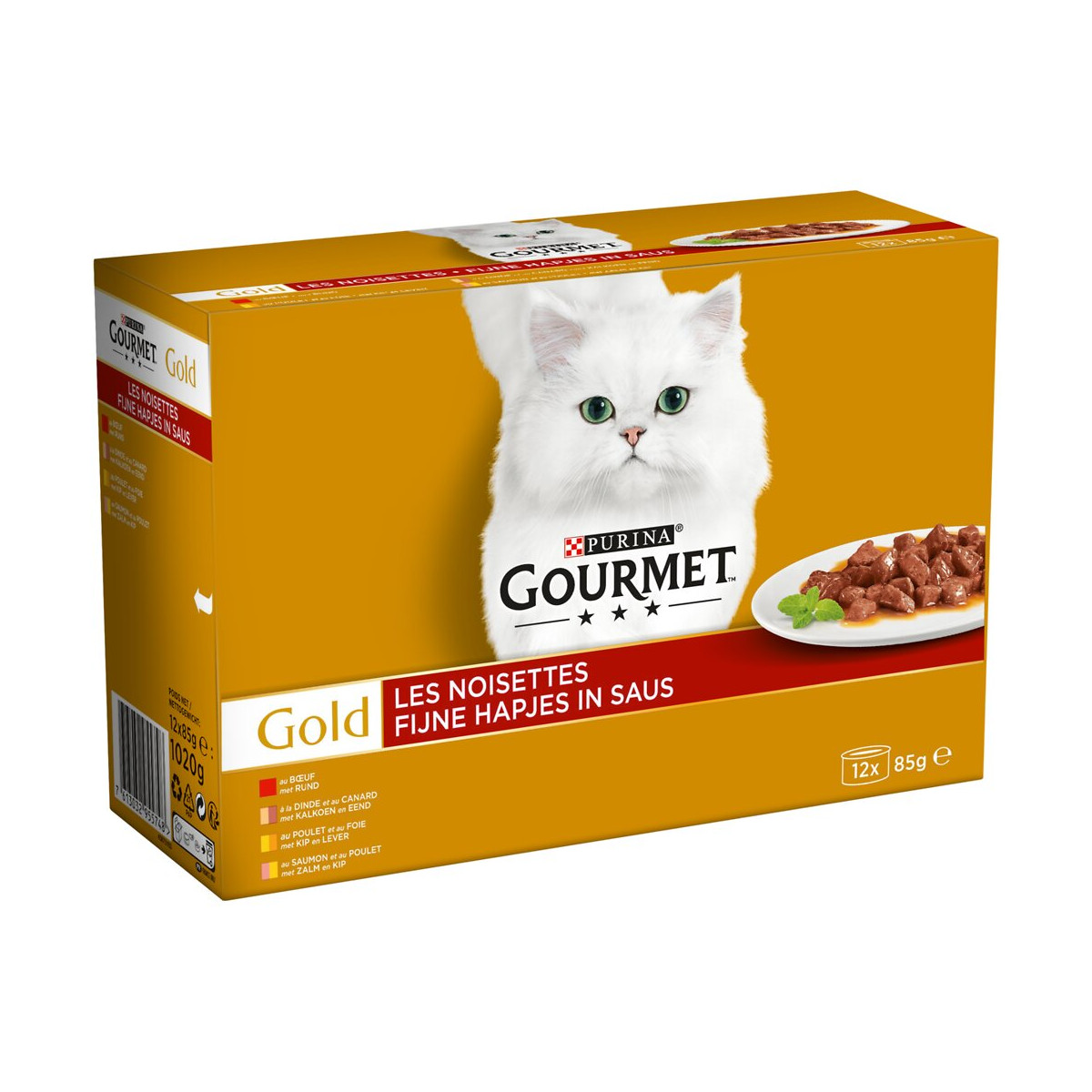 Tendres morceaux en sauce Les Noisettes Gourmet Gold de viandes ou de poissons. Aliment complet pour chat adulte. Boîtes de 85 g pour conserver la saveur de chaque repas. Contenance : 12 x 85 g. Sans arômes artificiels ajoutés, sans conservateurs artificiels ajoutés et sans colorants artificiels ajoutés.Spécifications techniques
