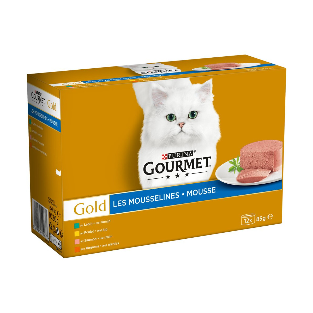 Mousses moelleuses aux viandes ou aux poissons Les Mousselines Gourmet Gold. Aliment complet pour chat adulte. Sachets de 85 g pour conserver la saveur de chaque repas. Contenance : 12 x 85 g.Spécifications techniques