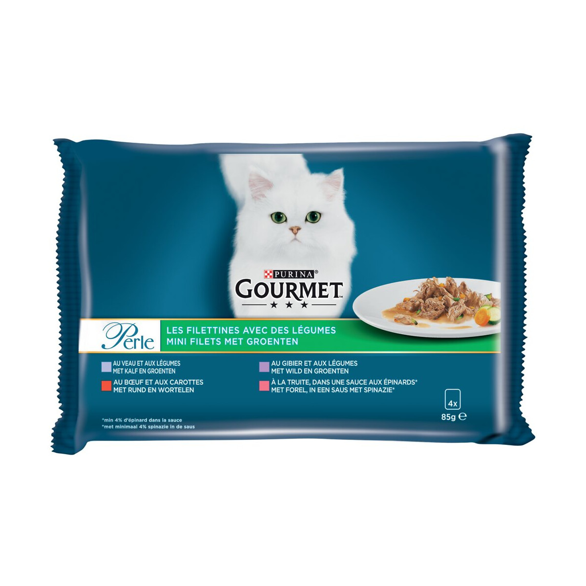 Sachets Émincés de viandes ou de poissons en sauce accompagnés de tendres légumes Les Filletines Gourmet Perle. Aliment complet pour chat adulte. Une expérience de goût irrésistible tous les jours. Sachets de 85 g pour conserver la saveur de chaque repas. Contenance : 4 x 85 g. Sans arômes artificiels ajoutés, sans conservateurs artificiels ajoutés et sans colorants artificiels ajoutés.Spécifications techniques