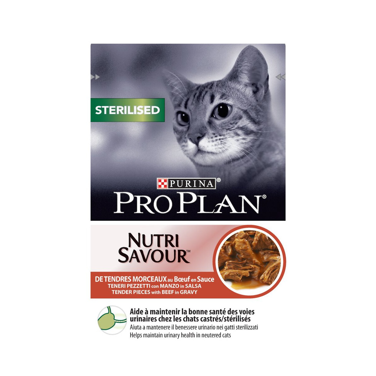 Aliment au boeuf en sauce Pro Plan Nutrisavour Sterilised complet et équilibré pour chat adulte stérilisé. Les tendres morceaux, associés à une sauce savoureuse, sont hautement appétents, grâce à une technologie exclusive de Nestlé PURINA. Nutrition haut de gamme dont les bénéfices pour la santé des chats sont scientifiquement démontrés. Facilement digestible grâce à des ingrédients de haute qualité. Santé urinaire : aide à maintenir la bonne santé des voies urinaires chez les chats castrés/stérilisés. Défenses naturelles : aide à maintenir des défenses naturelles, grâce à des antioxydants comme la vitamine E. Gestion du poids : aide à maintenir un poids de forme. Contenance : 85 g. Défenses naturelles : aide à maintenir des défenses naturelles, grâce à des antioxydants comme la vitamine E. Gestion du poids : aide à maintenir un poids de forme.Spécifications techniques