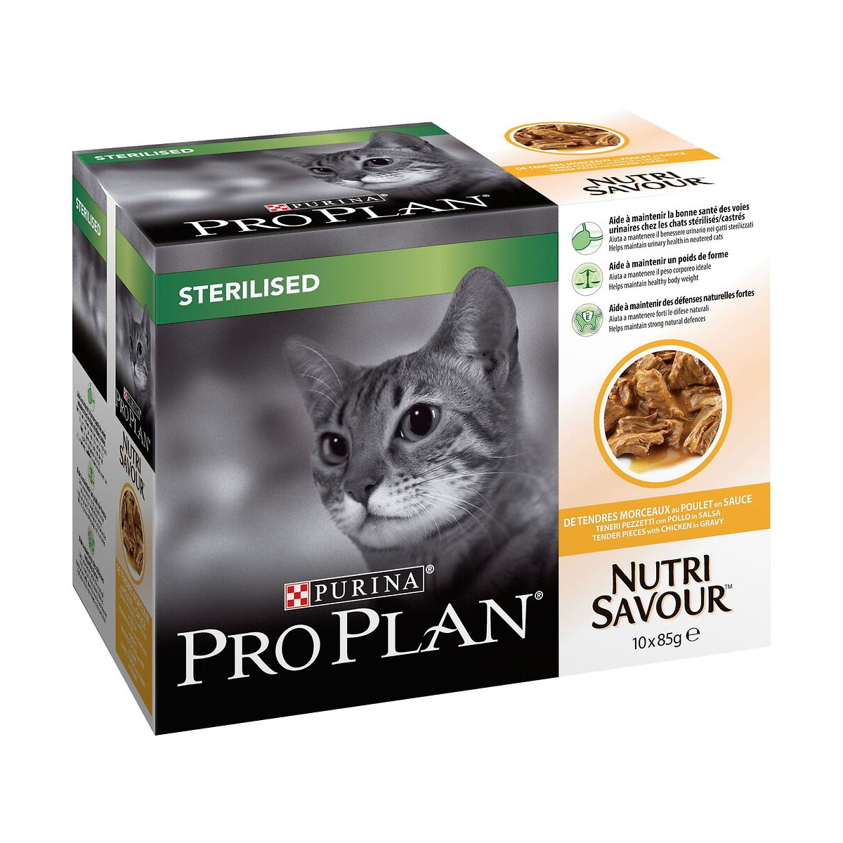 Aliment au poulet en sauce Pro Plan Nutrisavour Sterilised complet et équilibré pour chat adulte stérilisé. Les tendres morceaux, associés à une sauce savoureuse, sont hautement appétents, grâce à une technologie exclusive de Nestlé PURINA. Nutrition haut de gamme dont les bénéfices pour la santé des chats sont scientifiquement démontrés. Facilement digestible grâce à des ingrédients de haute qualité. Santé urinaire : aide à maintenir la bonne santé des voies urinaires chez les chats castrés/stérilisés. Défenses naturelles : aide à maintenir des défenses naturelles, grâce à des antioxydants comme la vitamine E. Gestion du poids : aide à maintenir un poids de forme. Contenance : 10 x 85 g. Défenses naturelles : aide à maintenir des défenses naturelles, grâce à des antioxydants comme la vitamine E. Gestion du poids : aide à maintenir un poids de forme. De tendres morceaux en sauce : les tendres morceaux, associés à une sauce savoureuse, sont hautement appétents, grâce à une technologie exclusive de Nestlé PURINA®.Spécifications techniques