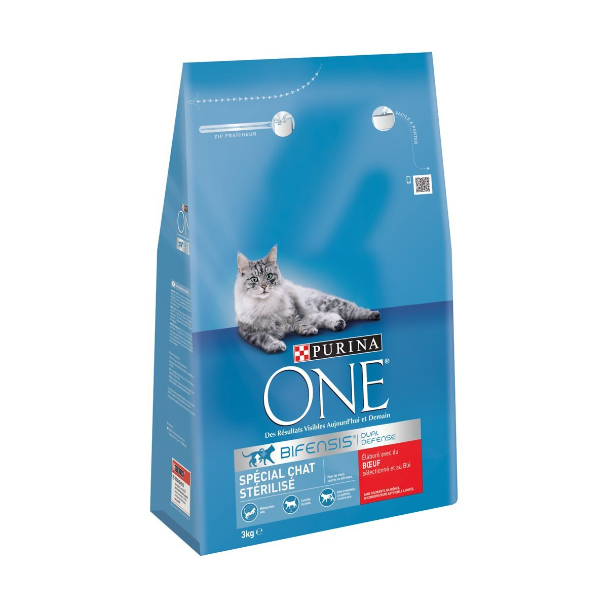 Croquettes au boeuf et au blé Pro Plan spécial chat stérilisé. Développée par nos vétérinaires et nutritionnistes, la formule unique BIFENSIS contient des bactéries fonctionnelles bénéfiques, scientifiquement prouvée pour aider à renforcer les défenses naturelles de votre chat. Elle présente tous les nutriments essentiels tels que des acides gras Oméga 6. Cette formule double défense contribue à la fois, à l'intérieur, à soutenir la production naturelle d'anticorps de votre chat et, à l'extérieur, à maintenir sa peau saine et son pelage brillant. Sans colorants, ni arômes et conservateurs artificiels ajoutés. Contenance : 3 kg. PURINA ONE Spécial Chat Stérilisé est spécifiquement formulé avec un profil nutritionnel adapté aux chats castrés ou stérilisés. Formulé pour aider à maintenir un métabolisme sain après la stérilisation/castration.Spécifications techniques