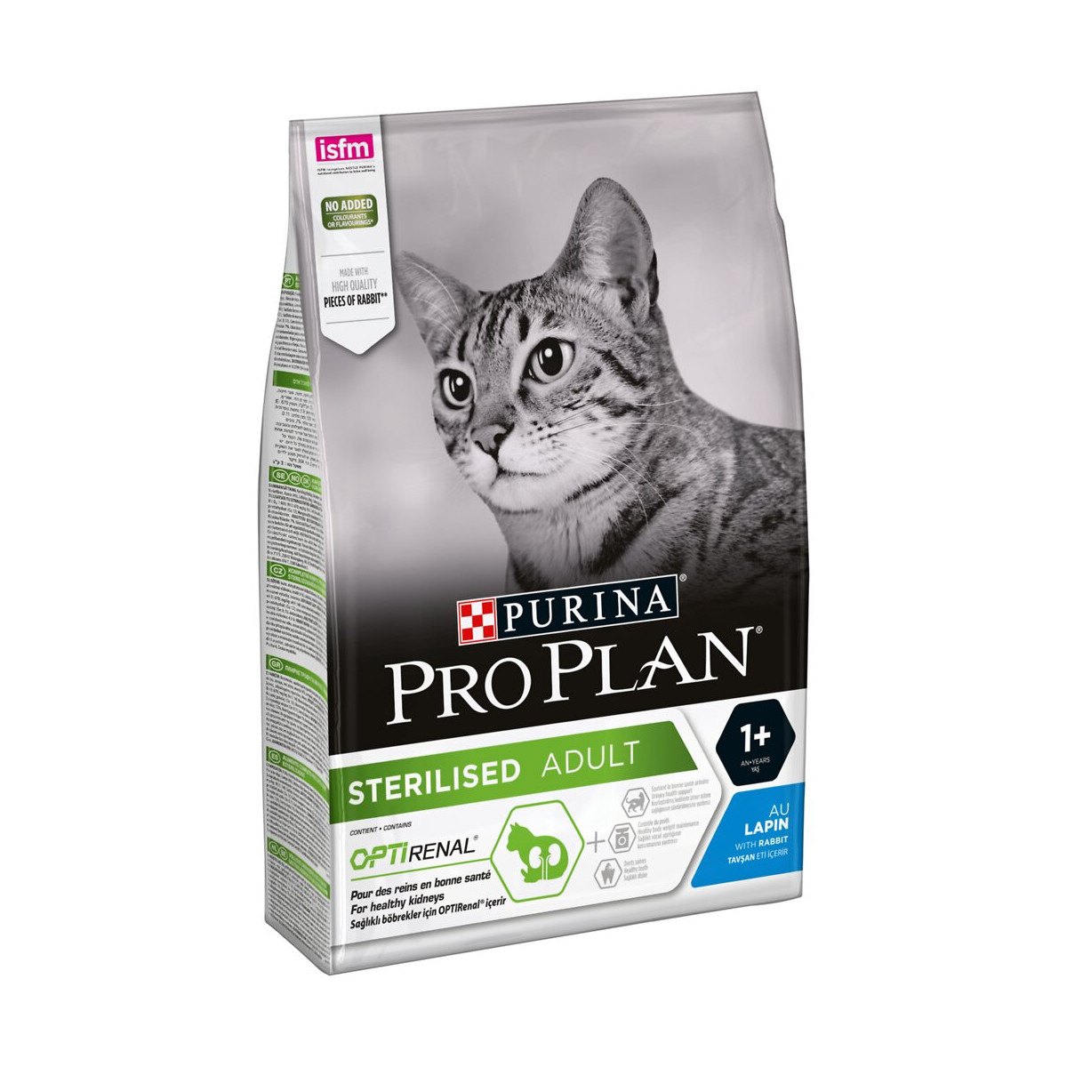 Croquettes au lapin Pro Plan Sterilised pour chat adulte. Formule qui associe tous les nutriments essentiels dont des vitamines A, C et E, ainsi que des acides gras oméga 3 et 6. Le tout dans un aliment à haute teneur en protéines et faible teneur en matières grasses. Aliment complet pour les chats adultes castrés ou stérilisés. Aide à maintenir un poids de forme grâce à un équilibre entre les protéines, carbohydrates et matières grasses. Protège les dents de votre animal contre la plaque dentaire et l'accumulation du tartre grâce à une texture de croquettes croquantes. La formule OPTIRENAL maintient la santé des voies urinaires des chats castrés/stérilisés, plus exposés aux risques de maladie du bas appareil urinaire. Sa formule conçue scientifiquement à partir d'ingrédients comprenant des acides aminés, des acides gras essentiels et des antioxydants, permet de limiter les risques de formation de calculs urinaires. Teneur élevée en protéines (41%) et faible en matières grasses (12%). Contenance : 3 kg. Contient des morceaux de lapin de haute qualité Sans colorants ajoutés. Sans arômes ajoutés.Spécifications techniques