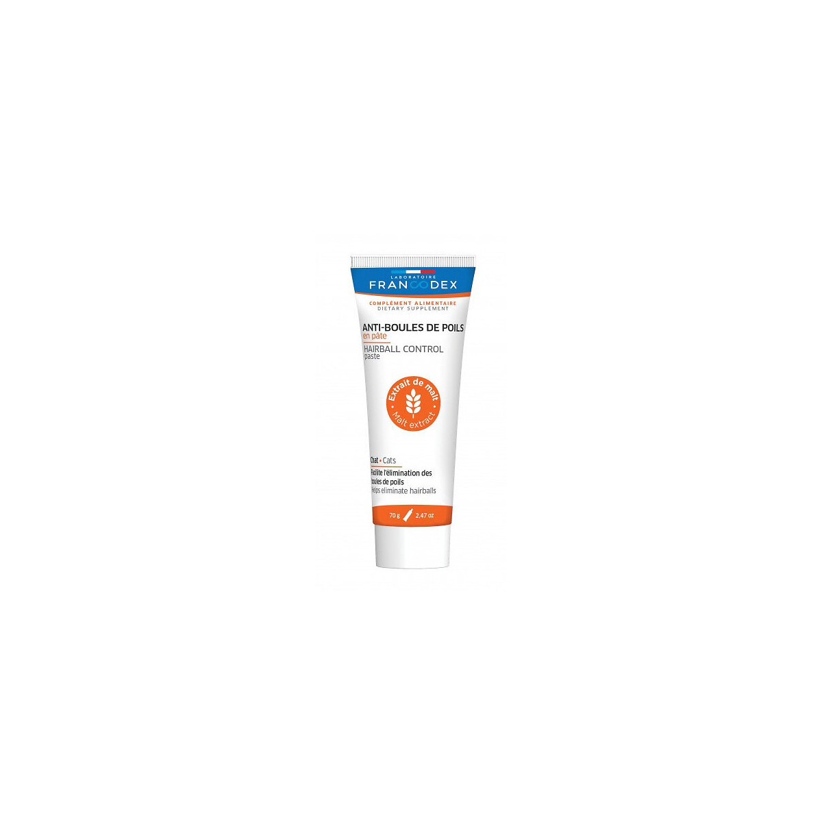 Anti-Boules de Poils en Pâte. Pour Chats. Tube de 70 g. Facilite l'élimination des boules de poils. Très appétent. A utiliser en complément d'un brossage régulier. Anti-Boules de Poils en Pâte. Pour Chats. Tube de 70 g. Facilite l'élimination des boules de poils. Très appétent. A utiliser en complément d'un brossage régulier. La PÂTE ANTI-BOULES DE POILS FRANCODEX, grâce à sa teneur en malt, aide à prévenir la formation des boules de poils au niveau du tube digestif des chats, et favorise leur élimination. Photo non contractuelle, car il y a plusieurs vendeurs sur une même fiche produit.Spécifications techniques
