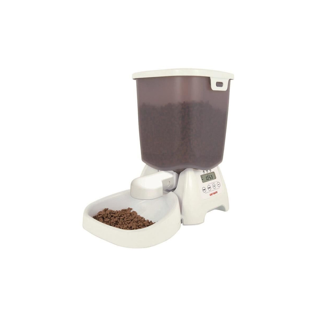 Cat Mate distributeur d'aliment - En plastique - Durée de vie de la batterie avec une utilisation constante 6 a 9 mois - Serrure sûre pour les animaux domestiques - Convient pour chats et petits chiens - Passe au lave-vaisselle - Commande LCD facile a programmer - Capacité : 3kg Coloris : blanc.Spécifications techniques