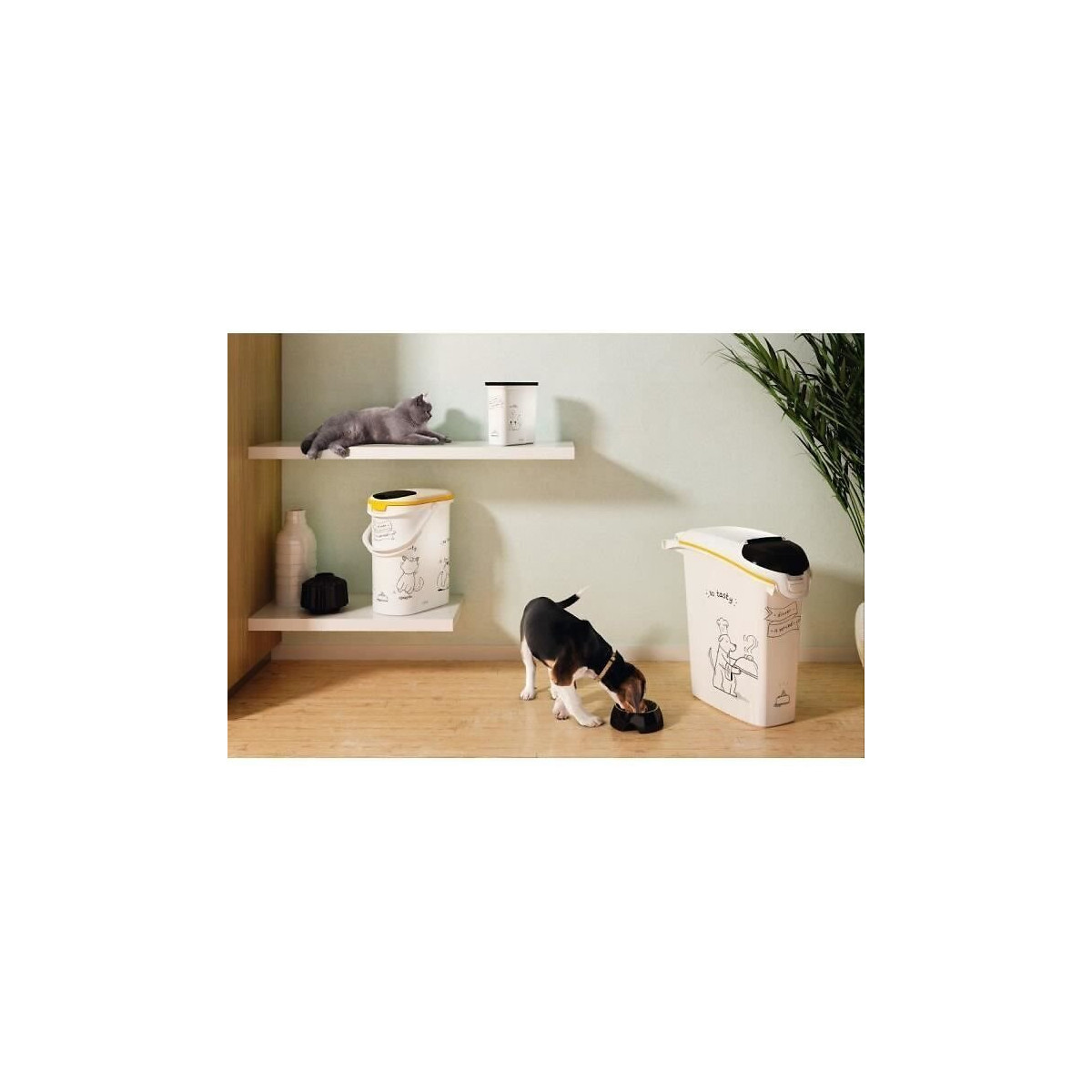 Conteneur de nourriture Le Diner est servi - 1 kg - 2 L - Blanc et noir - Pour chat - Pour stocker et conserver la nourriture de votre animal - Plastique - Poignée de préhension - Joint élastomere pour préserver la fraîcheur des aliments et éviter les odeurs - Double ouverture - Jauge pour mesurer le niveau - Godet inclus.Spécifications techniques