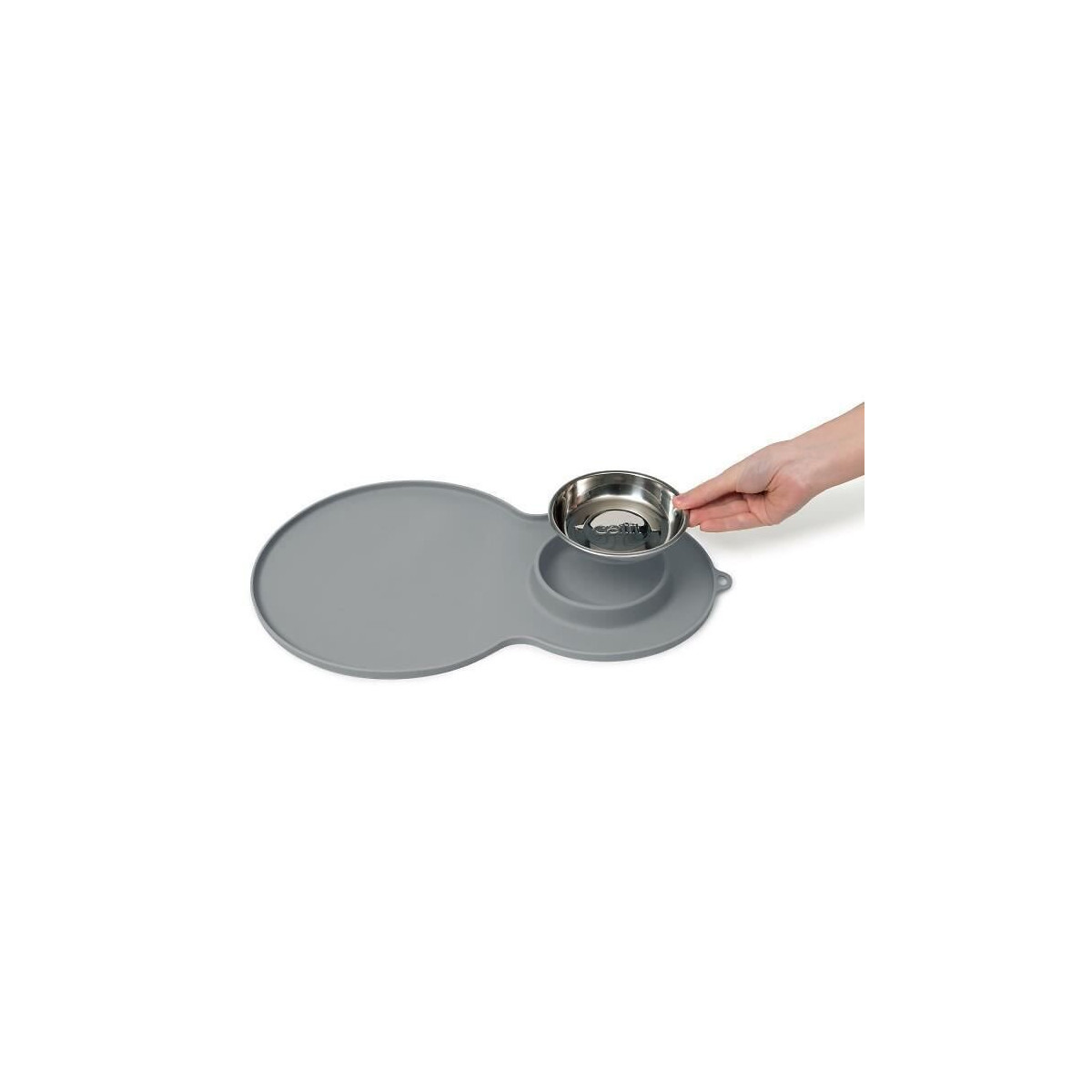 Napperon en forme d'arachide s'utilise parfaitement avec les abreuvoirs - Bol amovible en acier inoxydable - Silicone souple - Accessoire aidant a protéger les planchers et les comptoirs des dégâts d'eau et de nourriture - Anneau simplifiant le séchage ou l'entreposage - Format moyen - Gris - Pour chat.Spécifications techniques