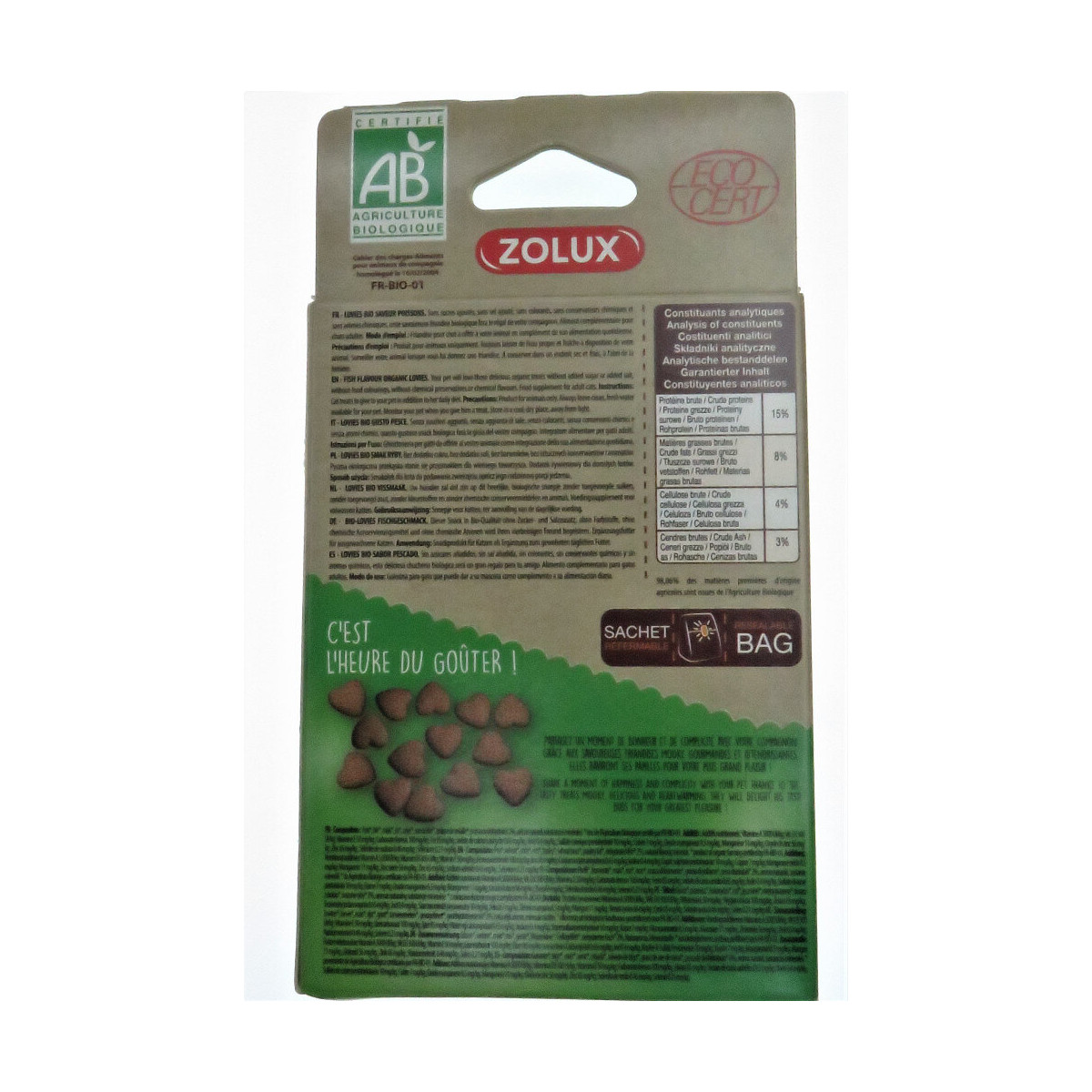 Friandise Mooky saveur poisson 50 g. pour chat. Partagez un moment de bonheur et de complicité avec votre compagnon grâce aux savoureuses friandises MOOKY. Gourmandes et attendrissantes, elles raviront ses papilles pour votre plus grand plaisir ! Ces savoureuses friandises biologiques saveur poisson sont sans sucres ajoutés, sans sel ajouté, sans colorants, sans conservateurs chimiques et sans arômes chimiques. De plus, elles sont fabriquées en France. Vendues dans un étui en carton avec flowpack refermable grâce à un sticker repositionnable. Friandises certifiées Agriculture Biologique par l'organisme EcoCert. Friandise Mooky saveur poisson 50 g. pour chat. Partagez un moment de bonheur et de complicité avec votre compagnon grâce aux savoureuses friandises MOOKY. Gourmandes et attendrissantes, elles raviront ses papilles pour votre plus grand plaisir ! Ces savoureuses friandises biologiques saveur poisson sont sans sucres ajoutés, sans sel ajouté, sans colorants, sans conservateurs chimiques et sans arômes chimiques. De plus, elles sont fabriquées en France. Vendues dans un étui en carton avec flowpack refermable grâce à un sticker repositionnable. Friandises certifiées Agriculture Biologique par l'organisme EcoCert. Composition : Pois*, blé*, maïs*, riz*, orge*, son de blé*, graisse de volaille*, poissons déshydratés 2%, arôme naturel, substances minérales. * issu de l'Agriculture Biologique certifié par FR-BIO-01. Composition analytique : protéine brute 15.00%, matière grasse 8.00%, cendre brute 3.00%, cellulose 4.00%. Additifs nutritionnels : Vitamine A 5000 UI/kg ; Vit. D Photo non contractuelle, car il y a plusieurs vendeurs sur une même fiche produit.Spécifications techniques
