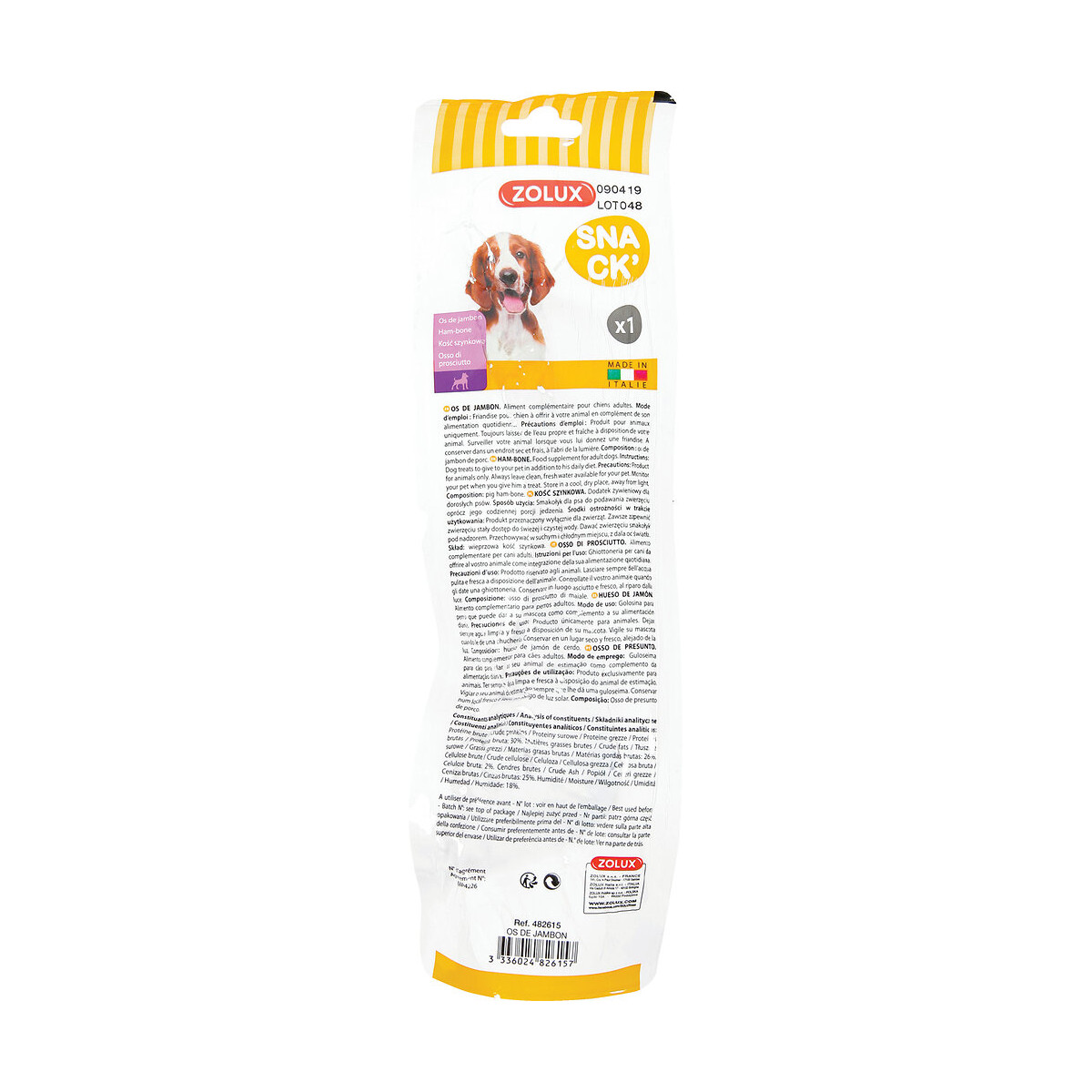 Os de jambon de porc. Fabriqué en Italie. Composition analytique : Protéine brute 30%, Matière grasse 25%, Cellulose 26%, Glucide 2%, Cendre brute 18%, Humidité 18%Spécifications techniques