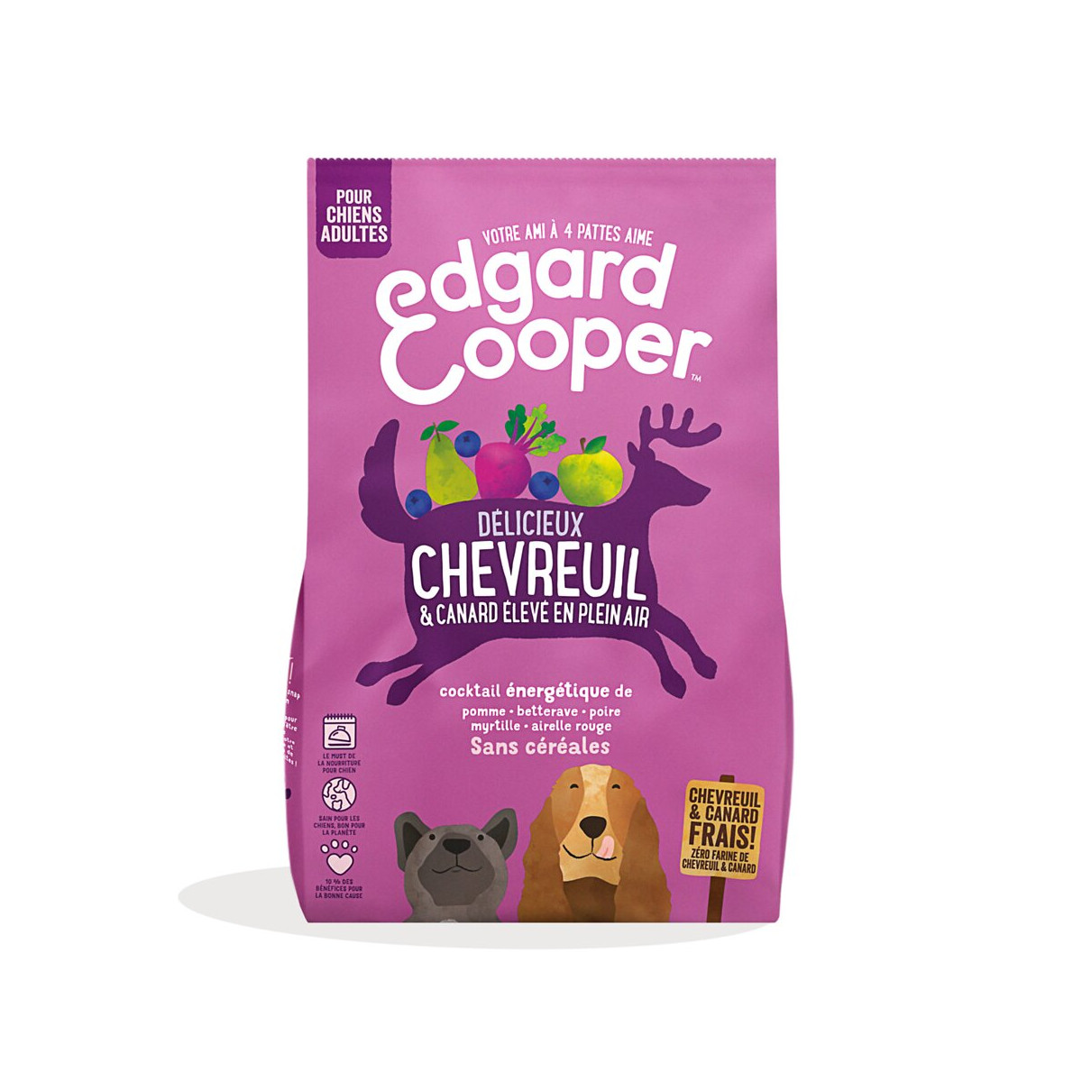 Notre recette au gibier frais et au canard élevé en liberté offre une source moins courante de protéines (sans viande séchée ou déshydratée) adaptée aux estomacs sensibles. Elle contient des pré-biotiques pour un intestin en bonne santé, et nous y avons ajouté de la patate douce qui libère de l'énergie dans la durée. Nos recettes incluent également un mélange super équilibré de fruits et de légumes, et des herbes et des végétaux riches en nutriments pour un coup de boost supplémentaire. Enfin, nous cuisons doucement nos croquettes pour préserver leurs saveurs et leurs bienfaits. Pour qui ? Pour qui est-ce bon ? Presque tous les chiens vont adorer cette recette, mais elle est particulièrement bonne pour les chiens à la peau sensible ou au ventre bouleversé. Le gibier et le canard frais regorgent de protéines de haute qualité et d'acides aminés essentiels, ce qui aidera votre chien à avoir une allure et un toucher exceptionnels. Comme la recette utilise deux viandes moins courantes, elle est souvent la solution idéale pour les chiens allergiques à d'autres aliments. Convient aux chiens adultes stérilisés ou actifs de toutes races. Points forts de la marque De la viande fraîche et des ingrédients naturels Sacs biodégradables d'origine végétale et boites recyclables 10% des bénéfices reversés à des associations Ethical Award Composition canard frais 35 %, patates douces, pois, protéines de pois, chevreuil frais 5 %, huile de poisson, sauce à base de canard, graine de lin, minéraux, manno-oligosaccharides (MOS), fructo-oligosaccharides (FOS), pommes 0,04 %, betterave 0,04 %, poires 0,04 %, myrtilles 0,04 %, airelles rouges 0,04 %, fleurs de calendula, orties, feuilles de mûrier, fenouil, carvi, camomille, mélisse officinale.Spécifications techniques