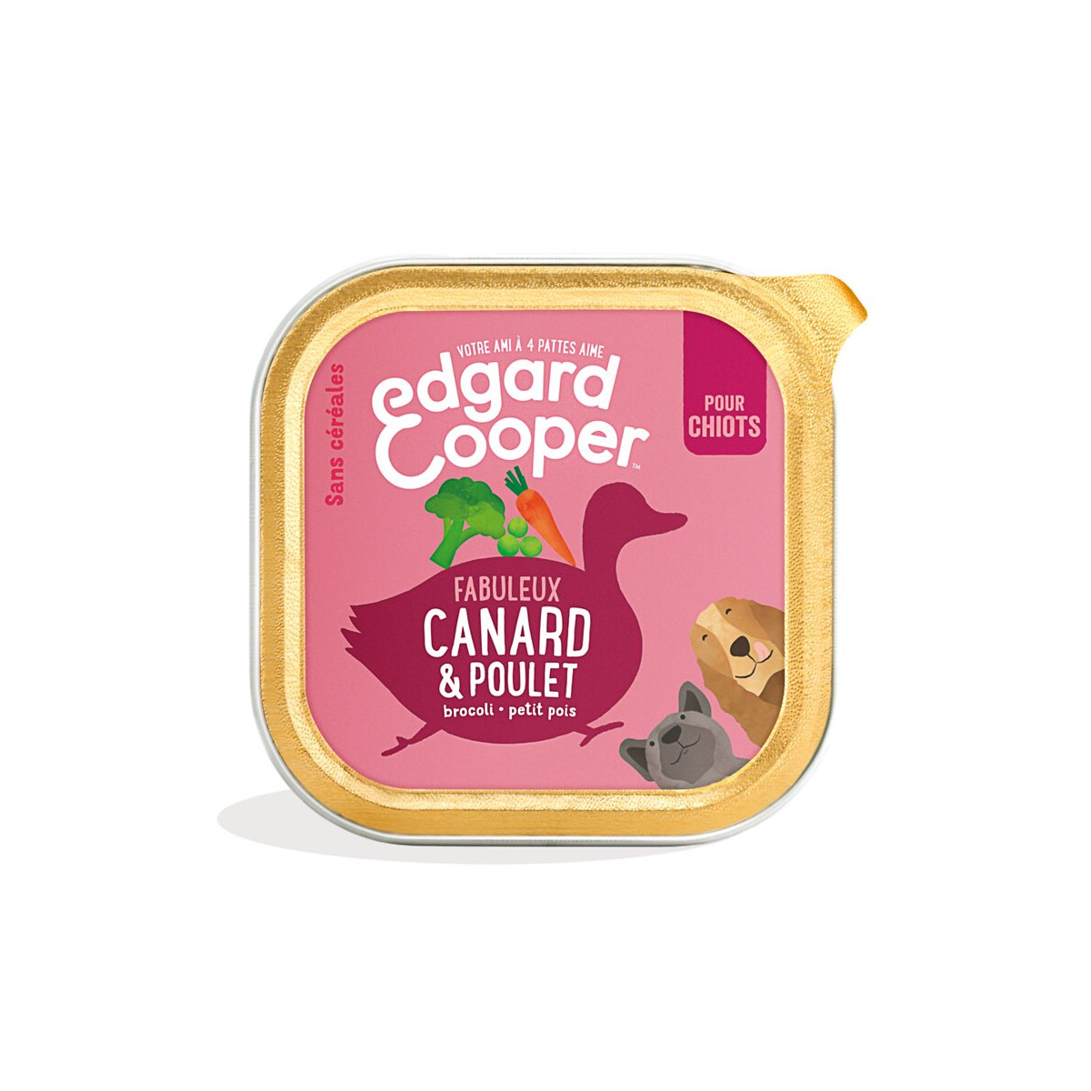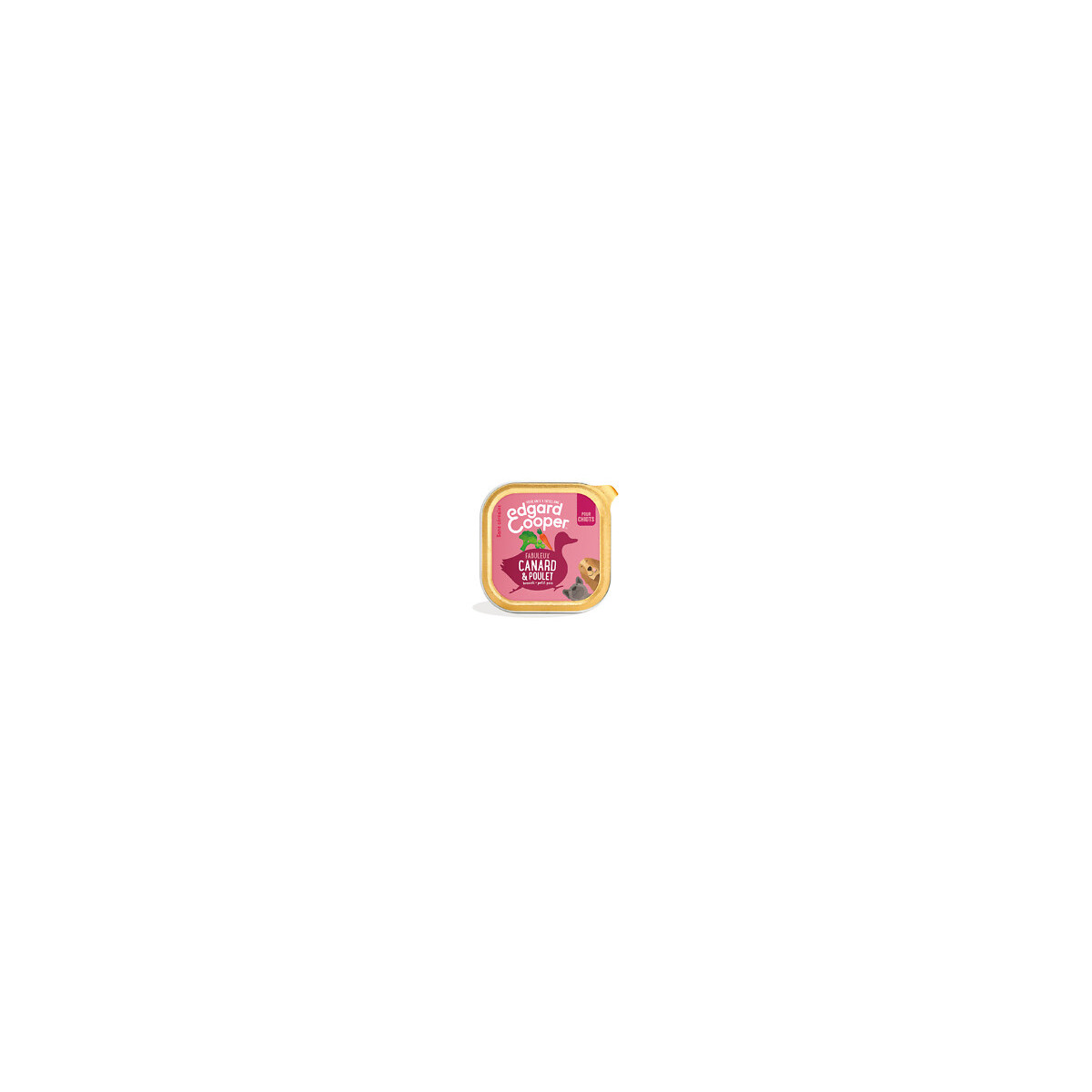Riche en canard et en poulet succulents, cette recette sans céréales a été conçue pour répondre aux besoins nutritifs des chiots en pleine croissance. Elle contient beaucoup de protéines maigres pour les aider à bâtir des muscles solides et à renforcer leur système immunitaire. De plus, nous combinons la viande avec des abats nobles (tels que le cœur et le foie) pour une dose de nutriments supplémentaire. Nos recettes incluent également un mélange super équilibré de fruits et de légumes, et des herbes et des végétaux qui boostent encore leur apport nutritionnel. Enfin, nous les cuisons doucement à la vapeur pour préserver leurs saveurs et leurs bienfaits. Pour qui ? Cette recette est parfaite pour les chiots qui ont beaucoup d'énergie. Avec une combinaison excitante de poulet et de canard, votre chiot finira sa gamelle en un rien de temps. Bien sûr, comme c'est une recette d'Edgard & Cooper, elle est aussi très bonne pour eux : la viande de canard les aide à développer leurs muscles, tandis que le poulet contribue à renforcer leur système immunitaire. Convient aux chiots stérilisés ou actifs de toutes races. Points forts de la marque De la viande fraîche et des ingrédients naturels Emballage recyclable 10% des bénéfices reversés à des associations Ethical Award Composition canard 30 %, poulet 26 %, minéraux, carottes 2 %, brocoli 1 %, pommes 1 %, potiron 1 %, pois 1 %, huile de saumon 0,5 %, persil 0,1 %, aneth 0,1 %.Spécifications techniques