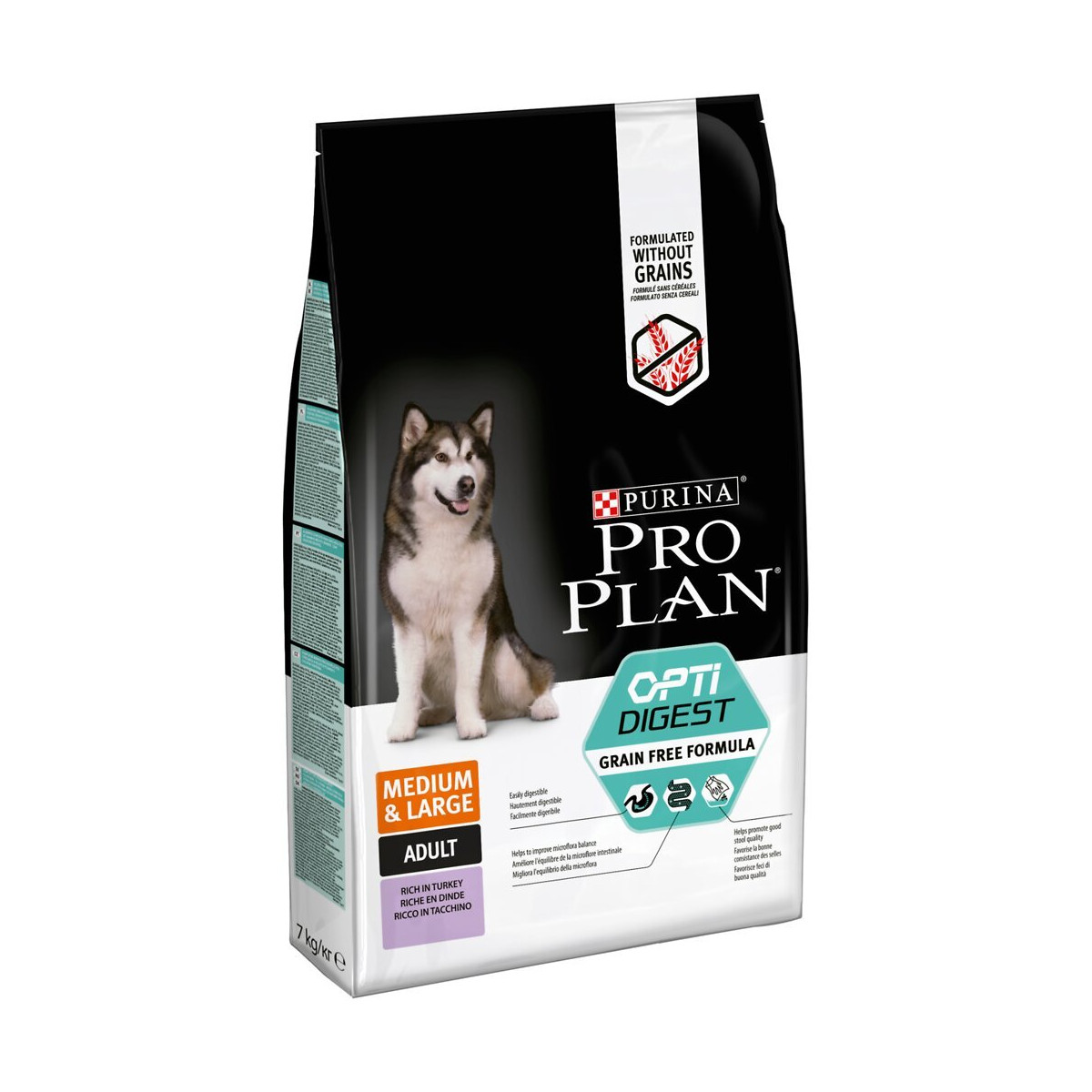 PURINA® PRO PLAN® Chien Medium & Large Adult Sensitive Digestion avec OPTIDIGEST® Formule sans céréales riche en Dinde. Une formule complète de croquettes sans céréales scientifiquement élaborée pour les chiens adultes de moyenne et grande taille ayant une digestion sensible. La formule contient OPTIDIGEST, une combinaison spécifique de nutriments pour soutenir le système digestif. Cette formule contient des ingrédients hautement digestibles (comme les œufs) qui facilitent la digestion et de la bentonite (une argile naturelle) pour favoriser la bonne consistance des selles. La nouvelle formule sans céréales est maintenant disponible, avec les mêmes bénéfices que les formules Purina PRO PLAN avec OPTIDIGEST. En remplaçant les céréales par du manioc et d'autres ingrédients clés nous élargissons notre offre pour les chiens ayant une digestion sensible, vous pouvez donc choisir la formule qui conviendra le mieux aux besoins de votre chien Favorise la bonne consistance des selles - Avec des ingrédients spécifiques pour favoriser la bonne santé intestinale et la bonne consistance des selles Contient des protéines de Dinde de haute qualité.Spécifications techniques