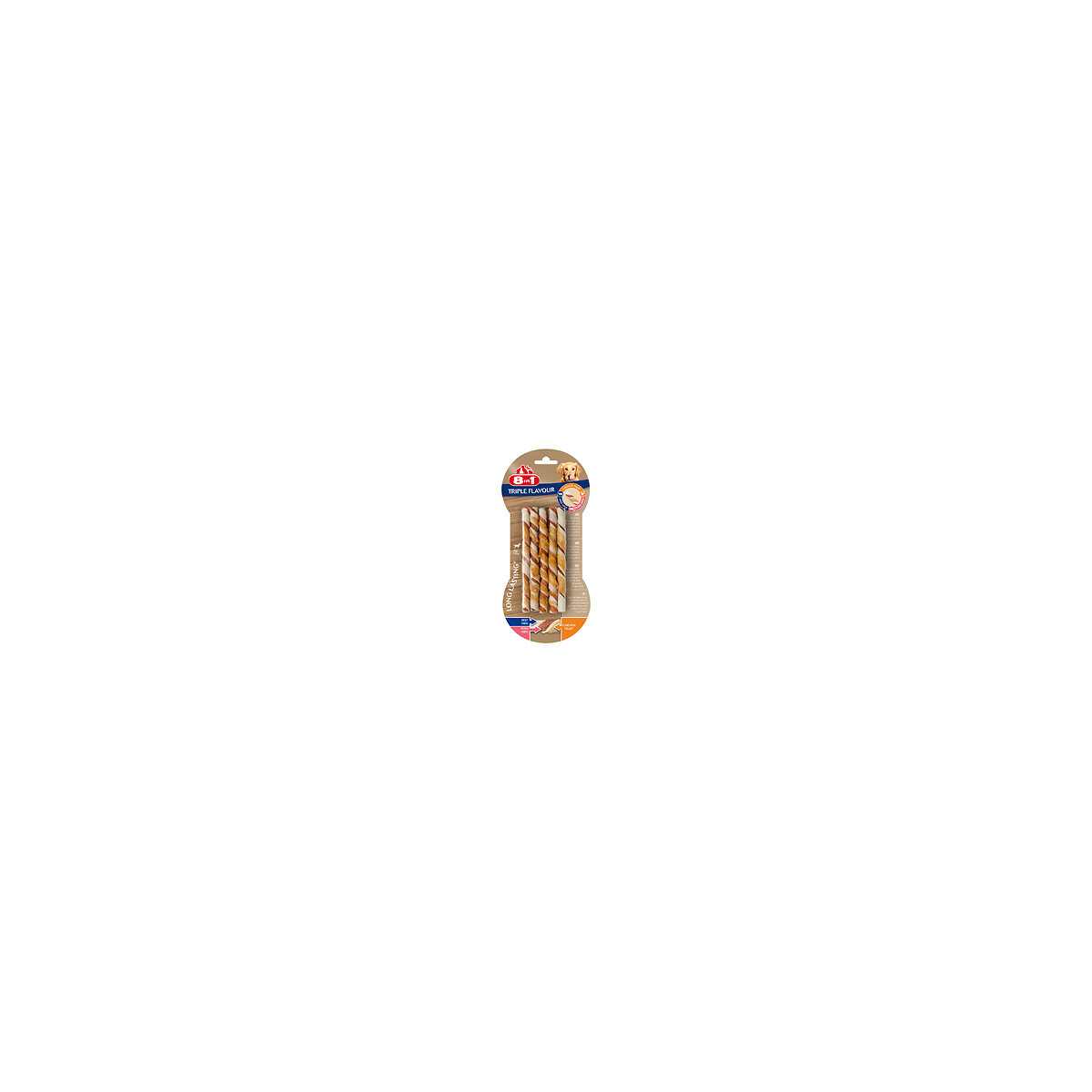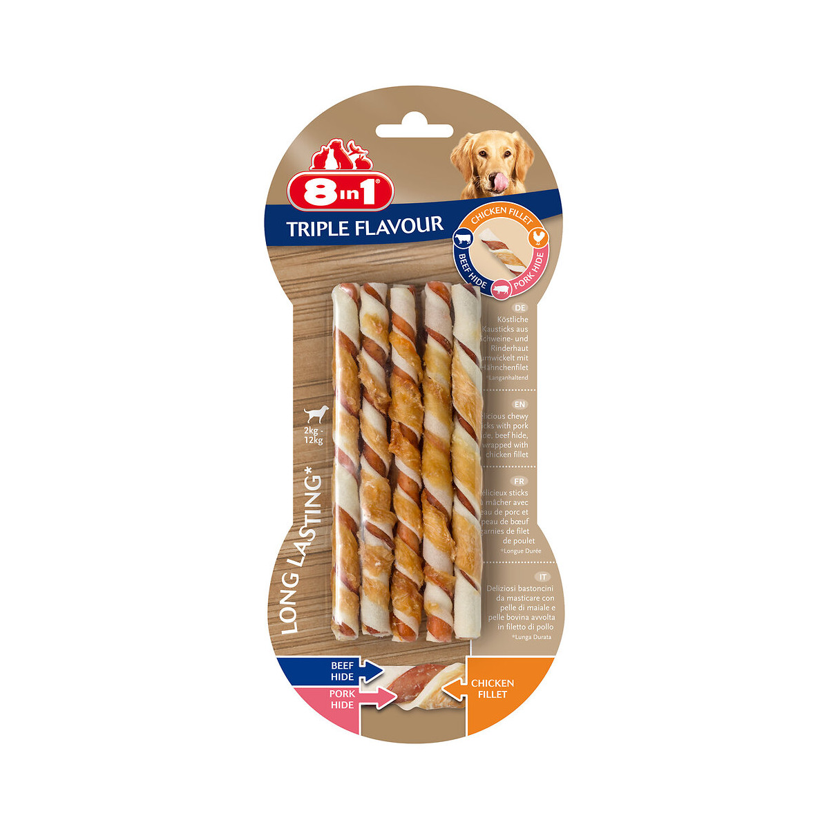Les sticks torsadés à mâcher 8in1 Triple Flavour sont composés de peau de porc et de bœuf et enroulée de filets de poulet pour retenir l'attention de votre chien. Plaisir de mastication de longue durée contribuant à limiter la plaque dentaire et le tartre. Bénéfices clés : Os à mâcher délicieux pour chiens de race moyenne à grande. Mastication longue durée pour garder votre chien joyeusement occupé. Contribue à réduire la formation de la plaque dentaire et du tartre. Riche en protéines. Sans sucres ajoutés, sans exhausteurs de goût, sans OGM ou conservateurs artificiels. Pour chiens de 2 à 12 Kg. Composition : Viandes et sous-produits animaux 58% peau de bœuf, 23% peau de porc, 9% filet de poulet, sous-produits d'origine végétale, minéraux.Spécifications techniques