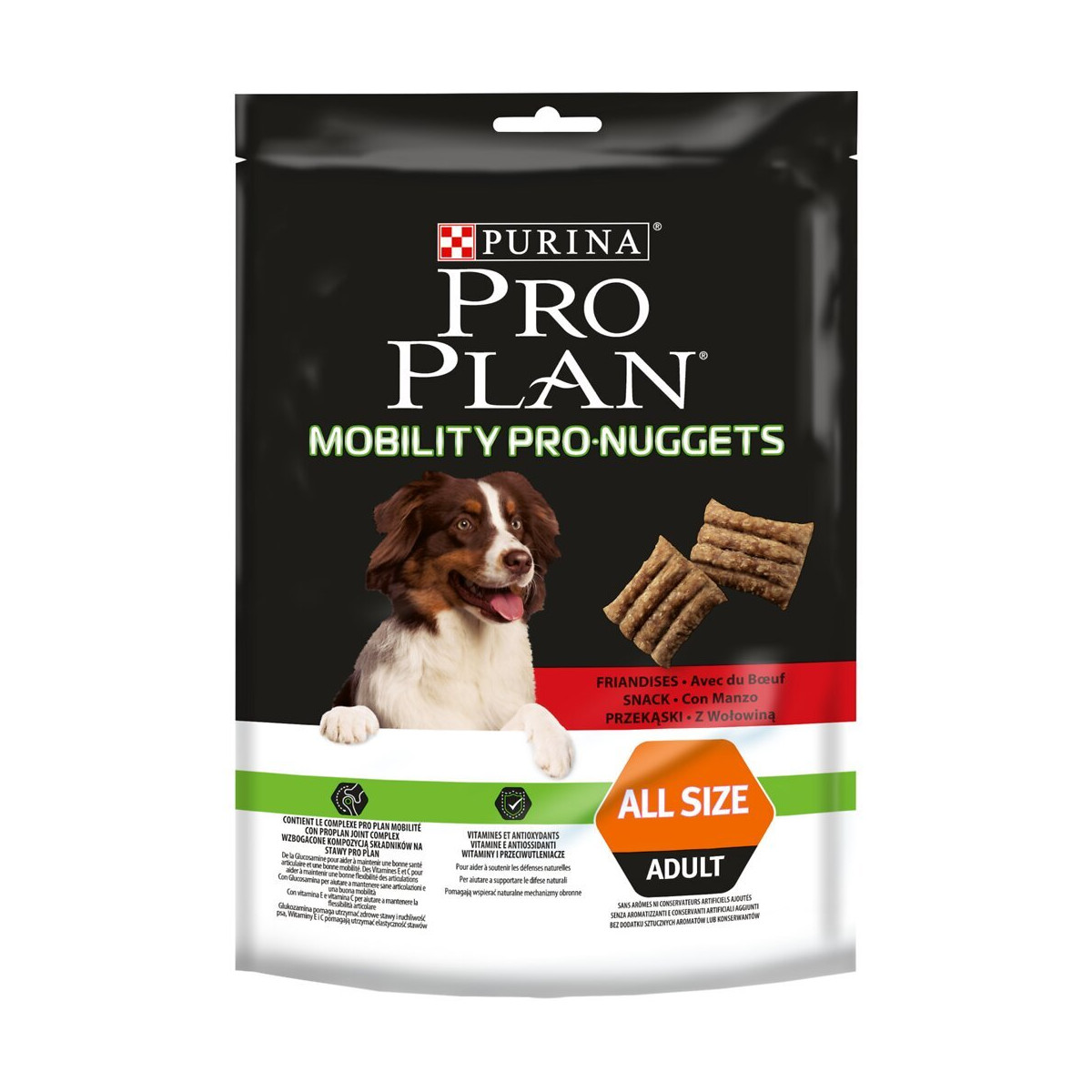 Notre équipe de nutritionnistes pour animaux de compagnie, en collaboration avec des experts de la santé animale, a mis au point, PRO PLAN Mobility PRO Nuggets, avec de la glucosamine pour aider à maintenir la bonne santé des articulations et la mobilité des chiens tout au long de leur vie. Mobility PRO Nuggets sont des friandises savoureuses pour chien adulte, votre chien les adorera à tout moment de la journée. Donnez-les en entier, ou coupez-les facilement en petits morceaux, idéal pour le dressage ou pour récompenser votre chien avec notre combinaison de nutriments la plus avancée et efficace. Formulé sans colorants ajoutés, sans arômes ni conservateurs artificiels ajoutés.Spécifications techniques