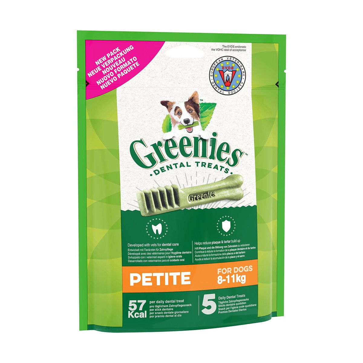 Stick dentaire pour chien. Avec des ingrédients 100% solubles et faciles à digérer, les bâtonnets à mâcher GREENIES™ s’intègrent complètement dans l’équilibre nutritionnel quotidien des chiens. Enrichies en vitamines et minéraux, ces friandises pour chiens contribuent à une alimentation saine. Prenez soin de son hygiène bucco-dentaire tout en lui faisant plaisir au quotidien. , Avec leur forme unique mi os, mi brosse et leur texture flexible, les sticks dentaires GREENIES™ contribuent à réduire la formation de la plaque dentaire le long de la ligne gingivale, favorisant ainsi une bonne hygiène bucco-dentaire et une haleine fraîche pour votre chien. Les friandises pour le soin des dents GREENIES™ sont disponibles dans différents formats afin de s’adapter au mieux au poids et la taille de votre chien. Cet aspect est important, car la forme du crâne d’un chien détermine la force avec laquelle il peut mordre, l’amplitude avec laquelle il peut ouvrir sa gueule. Les bâtonnets dentaires GREENIES™ , sont certifiés par le Veterinary Oral Health Council (VOHC) en tant que produit qui combat efficacement la plaque dentaire et le tartre sur les dents des chiens. La European Veterinary Dental Society (EVDS) approuve la certification accordée par le VOHC aux bâtonnets à mâcher GREENIES™.Spécifications techniques