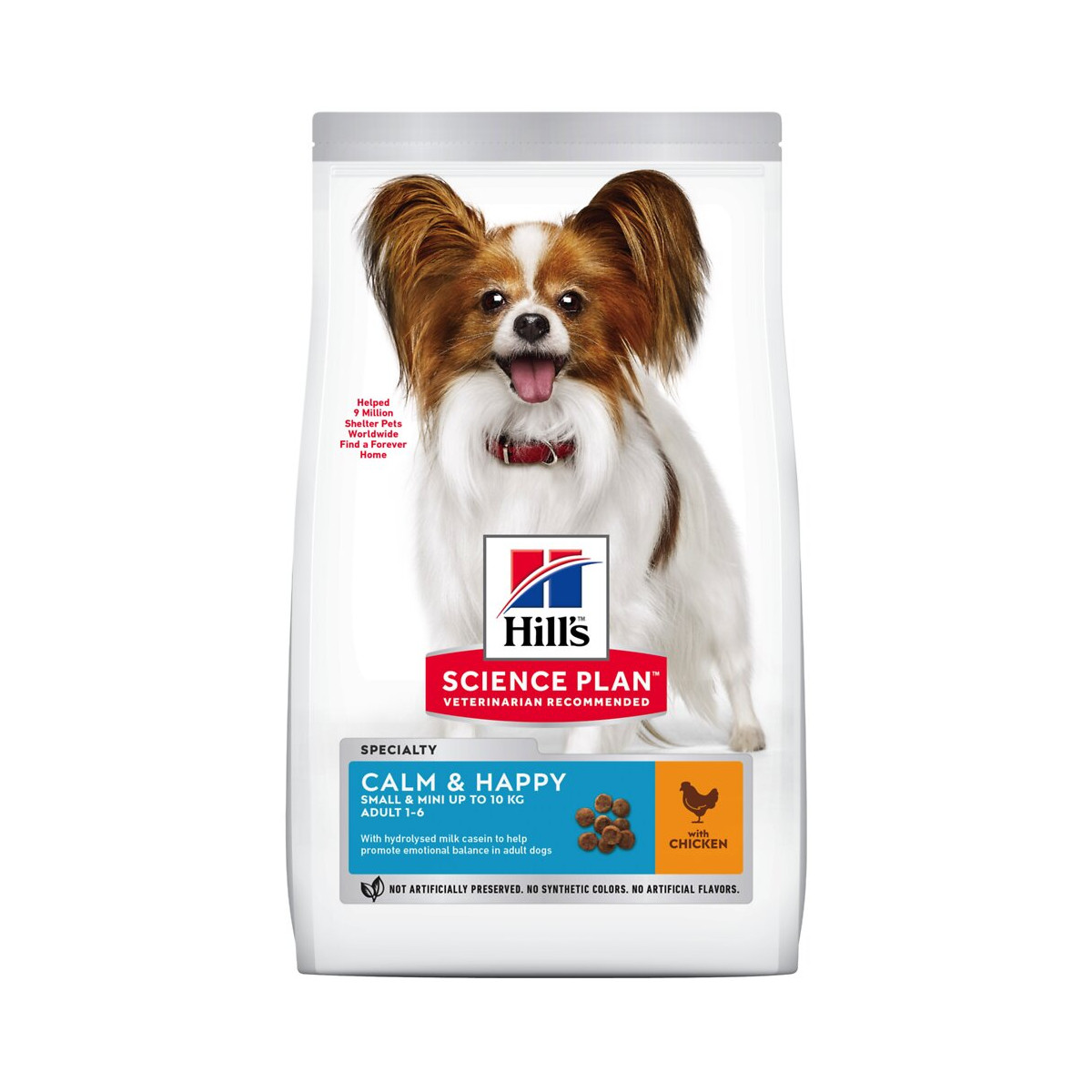 Les chiens de petites races peuvent parfois être stressés et une alimentation adaptée peut les aider à surmonter leurs angoisses quotidiennes. L'aliment HILL'S SCIENCE PLAN Calm & Happy Small & Mini contient des hydrolysats de protéines de lait pour favoriser le bon équilibre émotionnel des petits chiens, notamment dans des situations de stress comme la séparation, la présence d'étrangers ou le bruit. Grâce à sa teneur équilibrée en minéraux, il favorise la santé du cœur et des organes vitaux et son mélange spécial d'oméga-6 et d'oméga-3 nourrit la peau et le pelage de votre animal. Enfin, son mélange d'antioxydants unique renforce et soutient le système immunitaire de votre petit chien. En plus, vous allez adorer le nouveau look des sacs Science Plan. Elaboré à partir d'ingrédients de haute qualité. Aide à promouvoir l'équilibre émotionnel dans des situations comme la séparation, les bruits forts, les visiteurs. Contient des minéraux équilibrés pour un cœur et des organes vitaux sains. De la vitamine E, des oméga-6 et des nutriments dans une petite croquette pour une peau saine et un pelage brillant.Spécifications techniques