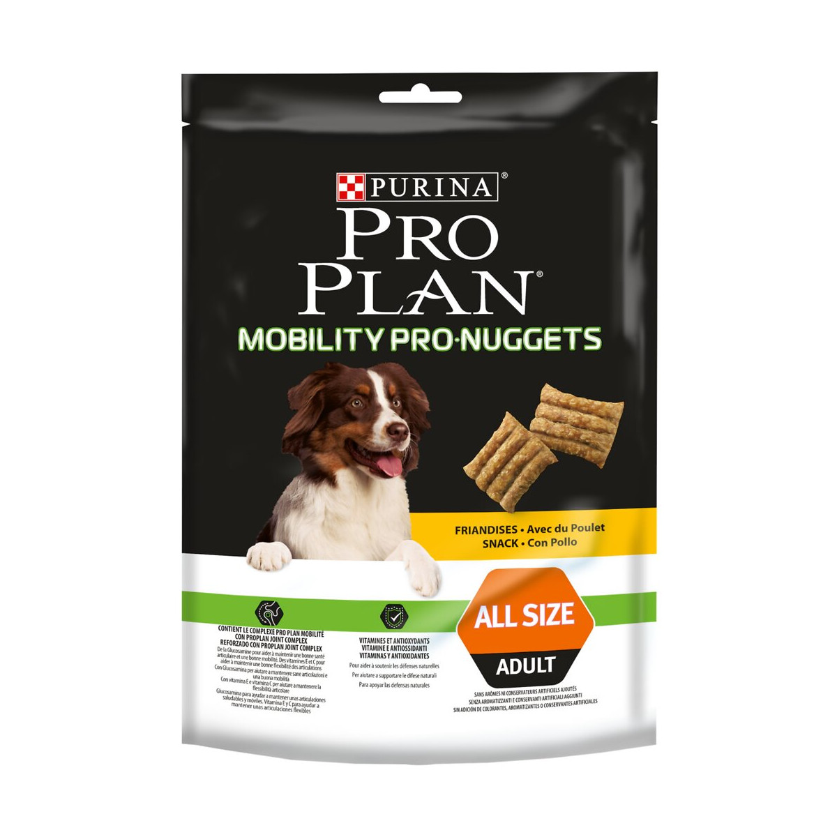 Notre équipe de nutritionnistes pour animaux de compagnie, en collaboration avec des experts de la santé animale, a mis au point, PRO PLAN Mobility PRO Nuggets, avec de la glucosamine pour aider à maintenir la bonne santé des articulations et la mobilité des chiens tout au long de leur vie. Mobility PRO Nuggets sont des friandises savoureuses pour chien adulte, votre chien les adorera à tout moment de la journée. Donnez-les en entier, ou coupez-les facilement en petits morceaux, idéal pour le dressage ou pour récompenser votre chien avec notre combinaison de nutriments la plus avancée et efficace. Formulé sans colorants ajoutés, sans arômes ni conservateurs artificiels ajoutés.Spécifications techniques
