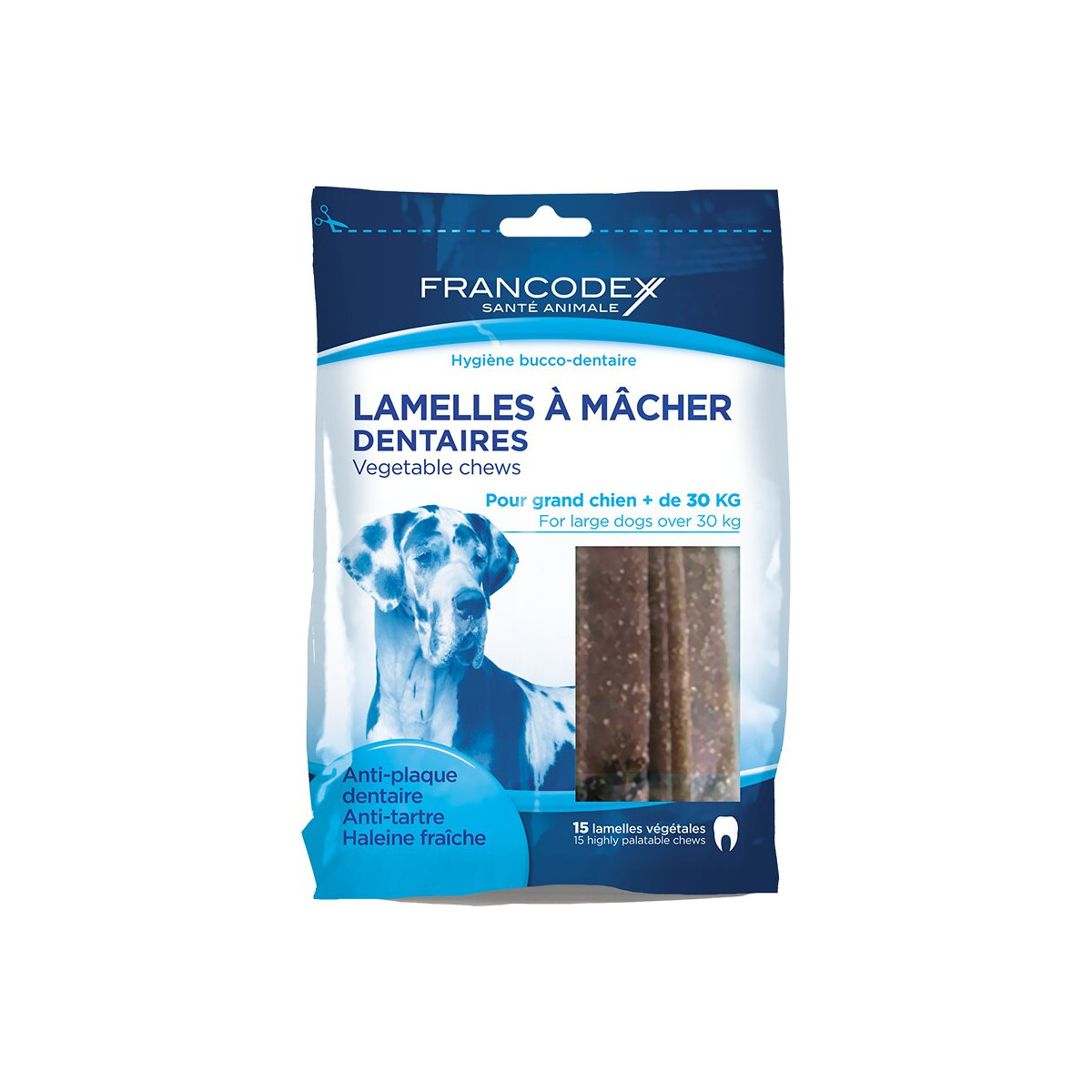 Les lamelles à mâcher pour grand chien Francodex permettent de réduire la formation de la plaque dentaire et du tartre grâce à une action mécanique abrasive non agressive. Leur forme en ‘Z’ spécifiquement conçue pour améliorer ce pouvoir abrasif, accentue également leur efficacité. Une utilisation régulière facilite le nettoyage simple des dents et des gencives de votre animal pour une hygiène bucco-dentaire parfaite. Convient aux chiens de + de 30 kg. Contenance : 490 g soit 15 lamelles.