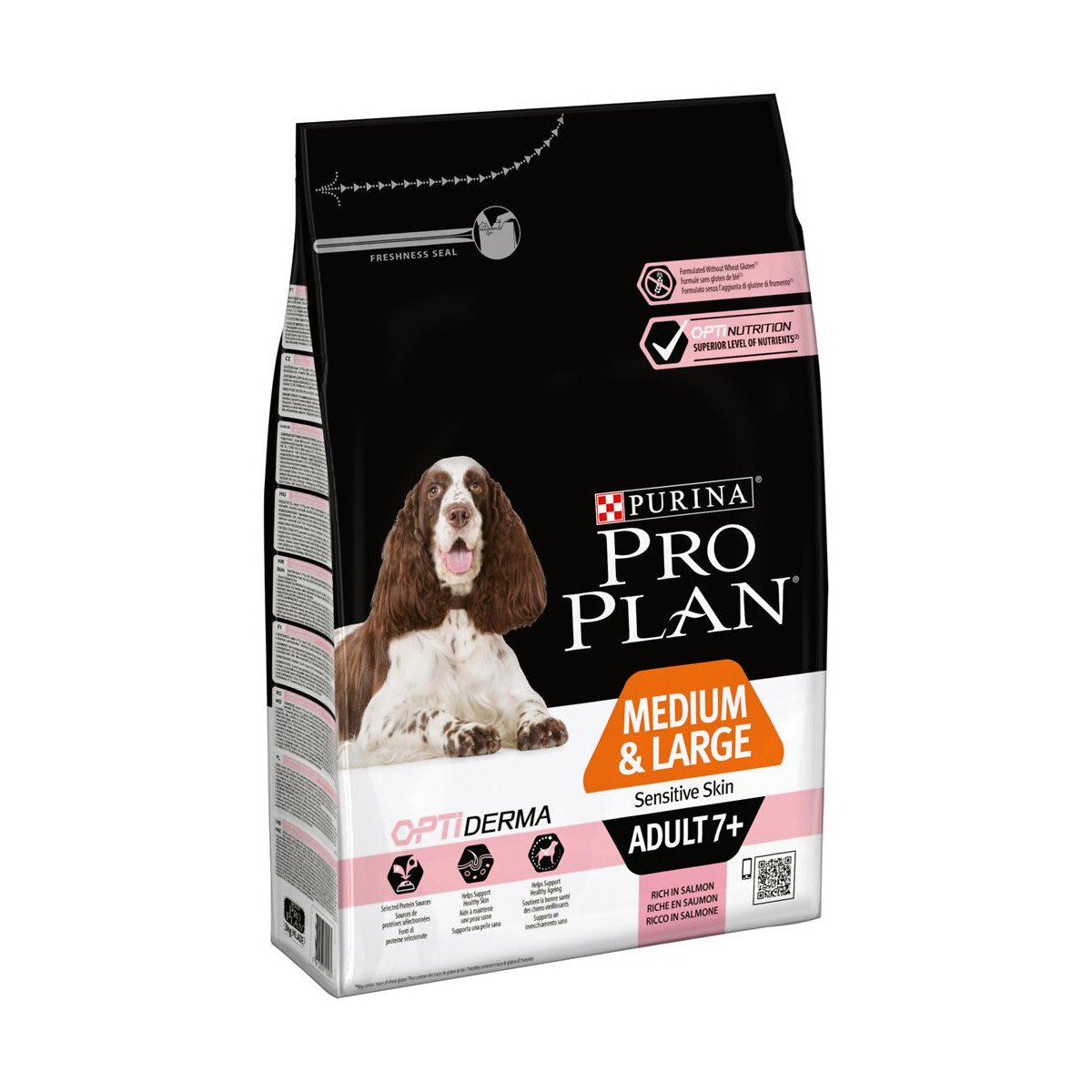 Croquettes riches en saumon Pro Plan Sensitive Skin Adult 7+ Medium & Large pour chien sénior de plus de 7 ans. Développée par nos vétérinaires et nutritionnistes, la formule Pro Plan OPTIDERMA fournit une nutrition adaptée qui aide à soutenir la peau sensible des chiens séniors. La formule OPTIDERMA contient une combinaison spécifique de nutriments cliniquement prouvée pour aider à maintenir une peau saine et un beau pelage ainsi que des sources de protéines sélectionnées pour aider à réduire les réactions cutanées associées à des sensibilités alimentaires. Aliment complet pour chiens adultes. Cliniquement prouvées pour aider à maintenir une peau saine, ces croquettes sont une source de protéines sélectionnées pour les chiens sensibles. Une combinaison de nutriments essentiels et des protéines de saumon de haute qualité pour aider à soutenir la bonne santé des articulations. Contenance : 3 kg. Cliniquement prouvé pour aider à maintenir une peau saine Soutient la bonne santé des chiens vieillissants grâce à une nutrition adaptée.Spécifications techniques