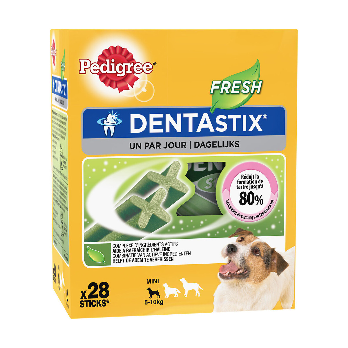4 chiens sur 5 de plus de 3 ans ont des problèmes bucco-dentaires. Ils sont causés par le développement de la plaque dentaire et du tartre. Une bonne hygiène bucco-dentaire représente le meilleur moyen de les réduire. Les bâtonnets à mâcher Pedigree DentaStix fresh vous aident à garder les dents et les gencives de votre chien en bonne santé et l'aident également à garder une haleine fraîche. Les bâtonnets à mâcher DentaStix fresh contiennent de l'huile d'eucalyptus et des extraits de thé vert qui aident à rafraîchir l'haleine du chien. En utilisation quotidienne, ces bâtonnets en forme de X aident à réduire jusqu'à 80% la formation de tartre, grâce à leur texture spéciale et aux ingrédients actifs. Pedigree DentaStix fresh est également faible en matières grasses, sans sucres ajoutés, sans colorant ni arôme artificiel. Paquet de 28 sticks.Spécifications techniques