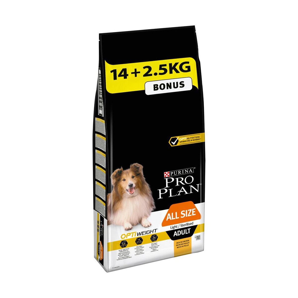 PRO PLAN Dog All sizes Adult Light/Sterilised - 14 + 2,5 KG - Croquettes pour chien adulte Aide à réduire la sensation de faim grâce à une teneur élevée en protéines et des niveaux optimaux en glucides complexes et en fibres. Une combinaison de nutriments essentiels pour aider à soutenir la bonne santé des articulations.Spécifications techniques